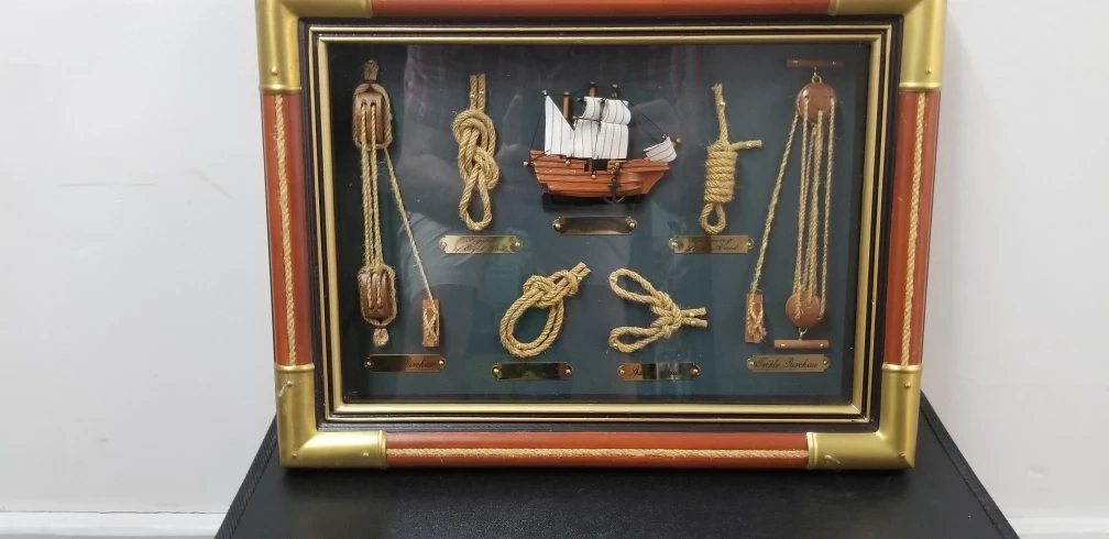 Framed nautical wall art. Features various sailing knots and a miniature ship. Wooden frame with glass front. Perfect for nautical-themed decor.