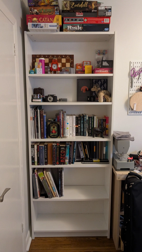 Tall white Ikea Billy bookshelf, five shelves. Holds books, board games, and other items. In good condition.