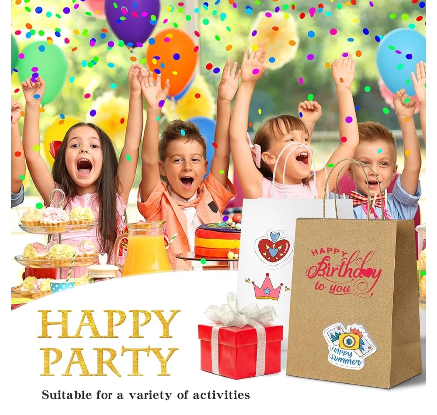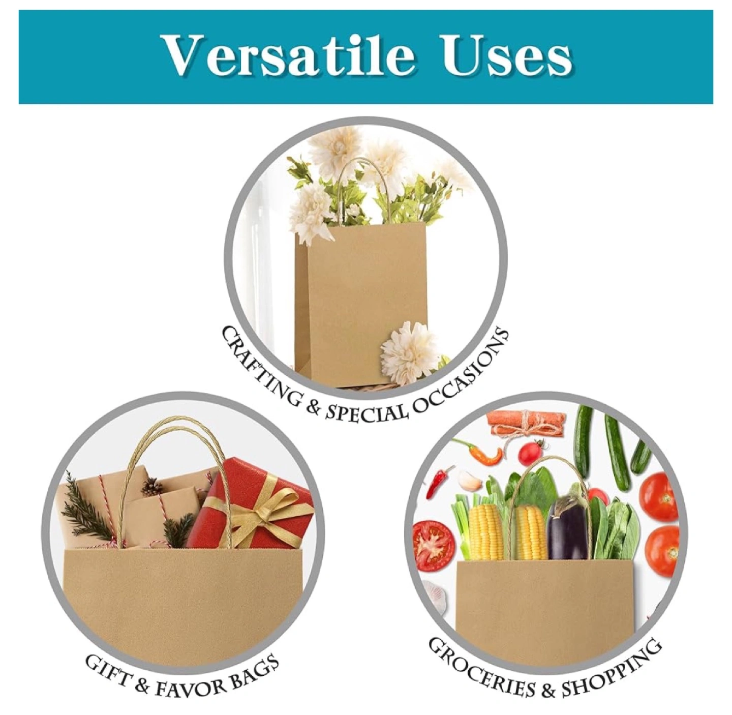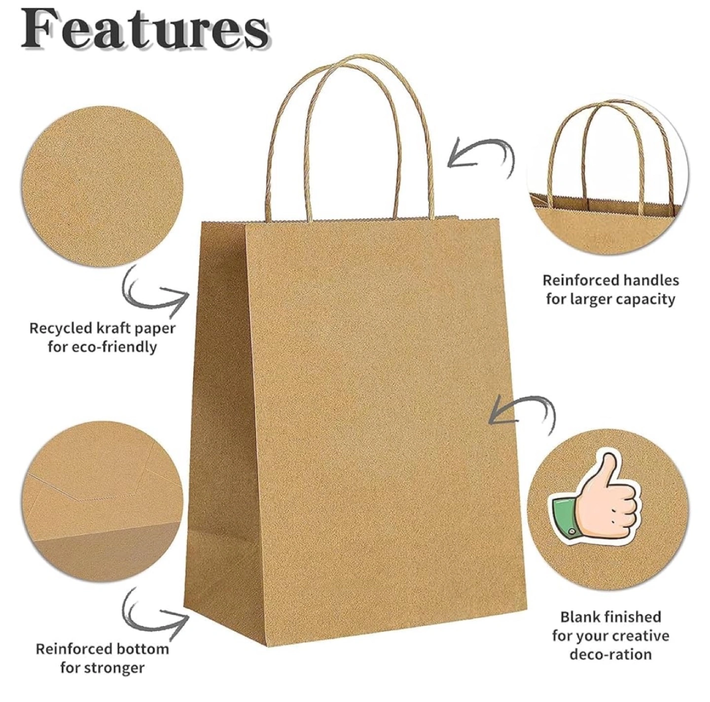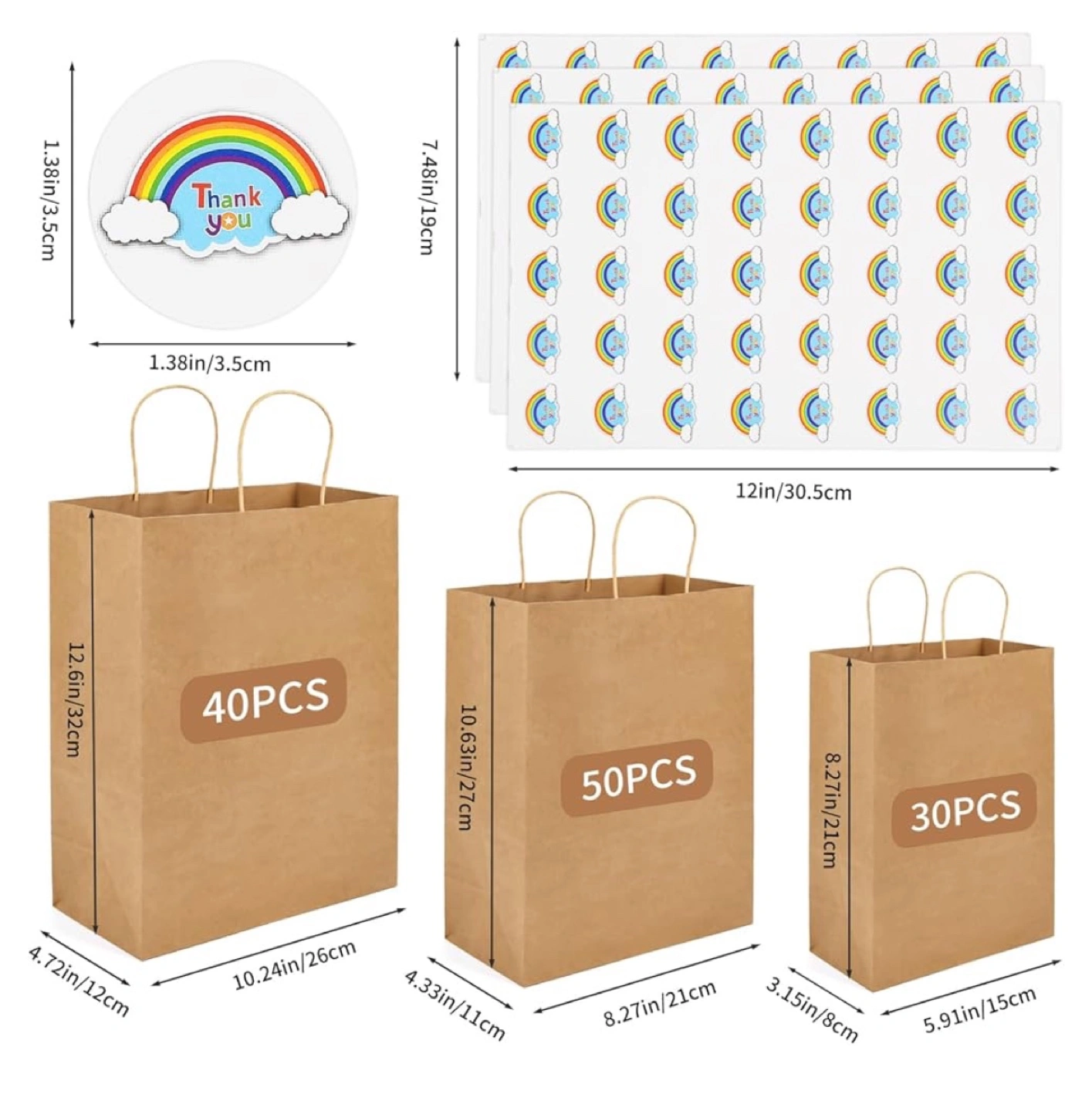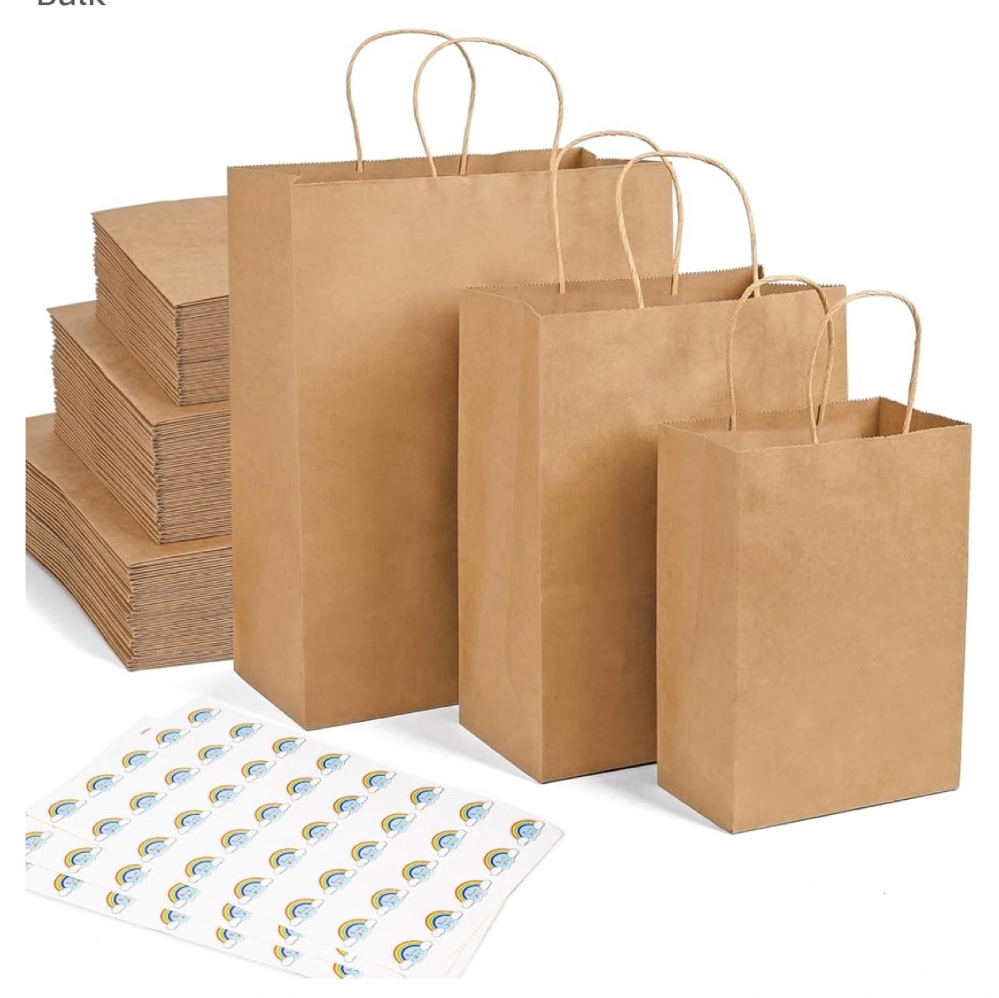 BRAND NEW NEVER USED ! Set of 120 kraft paper bags, three sizes. Reinforced handles and bottom. Eco-friendly recycled kraft paper. Includes thank you stickers. Perfect for gifts, groceries, or crafting.