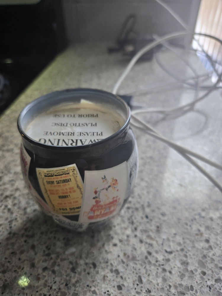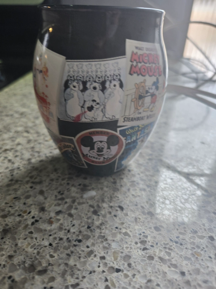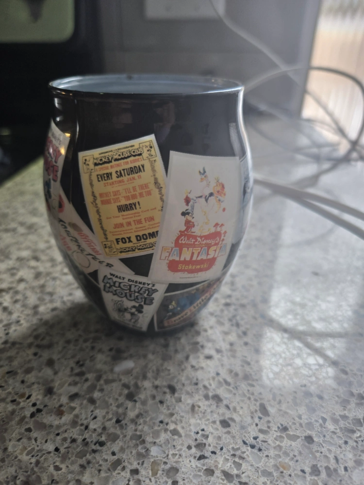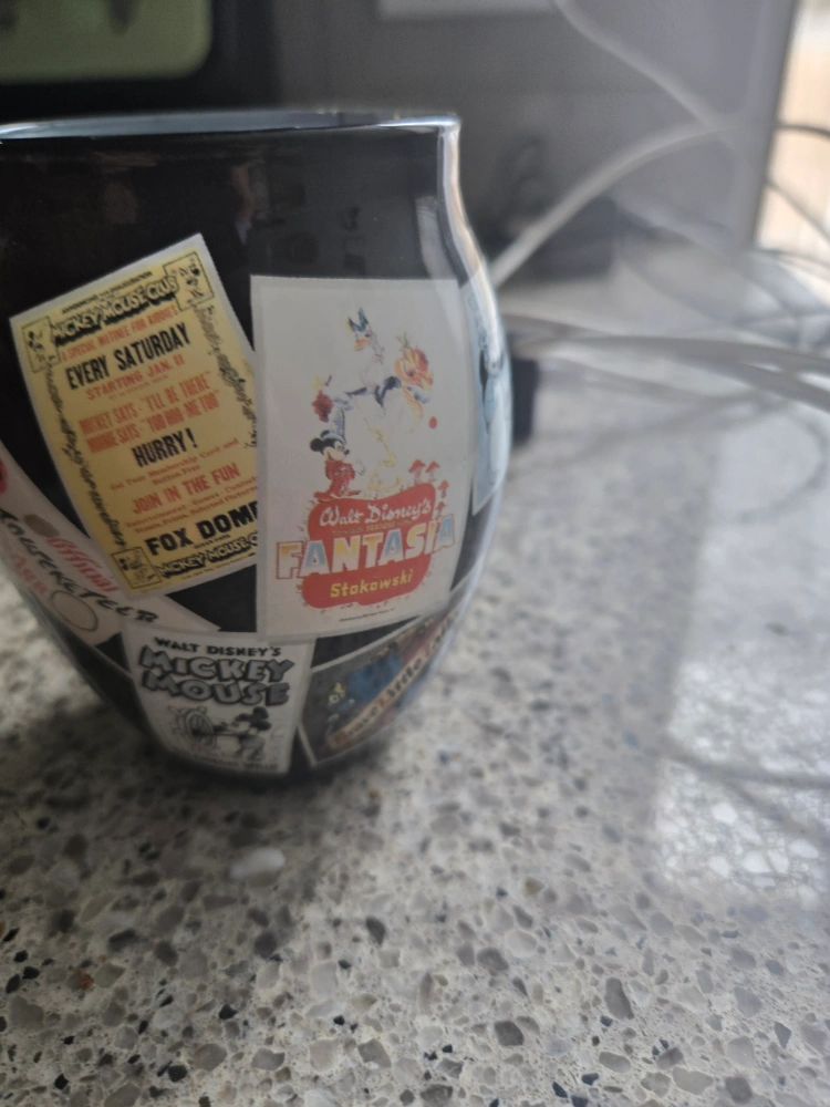 Black ceramic wax warmer. Features vintage Disney artwork including Fantasia and Mickey Mouse. Please remove plastic disc prior to use. Unique collectible.