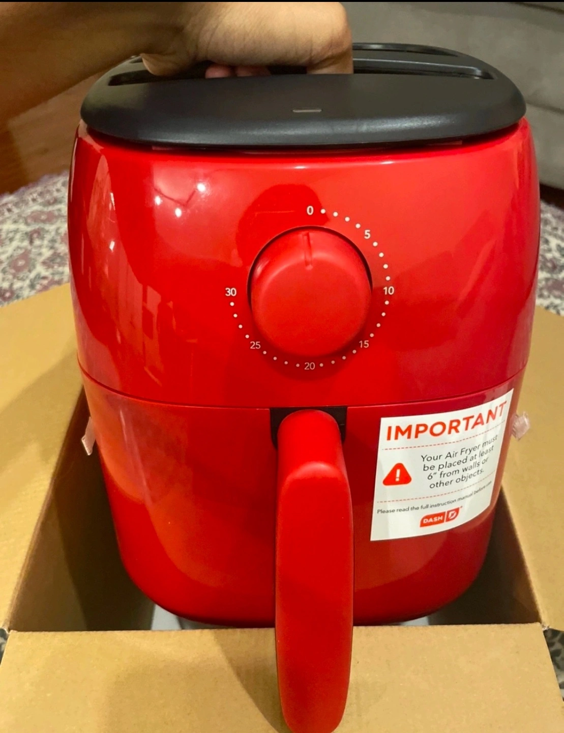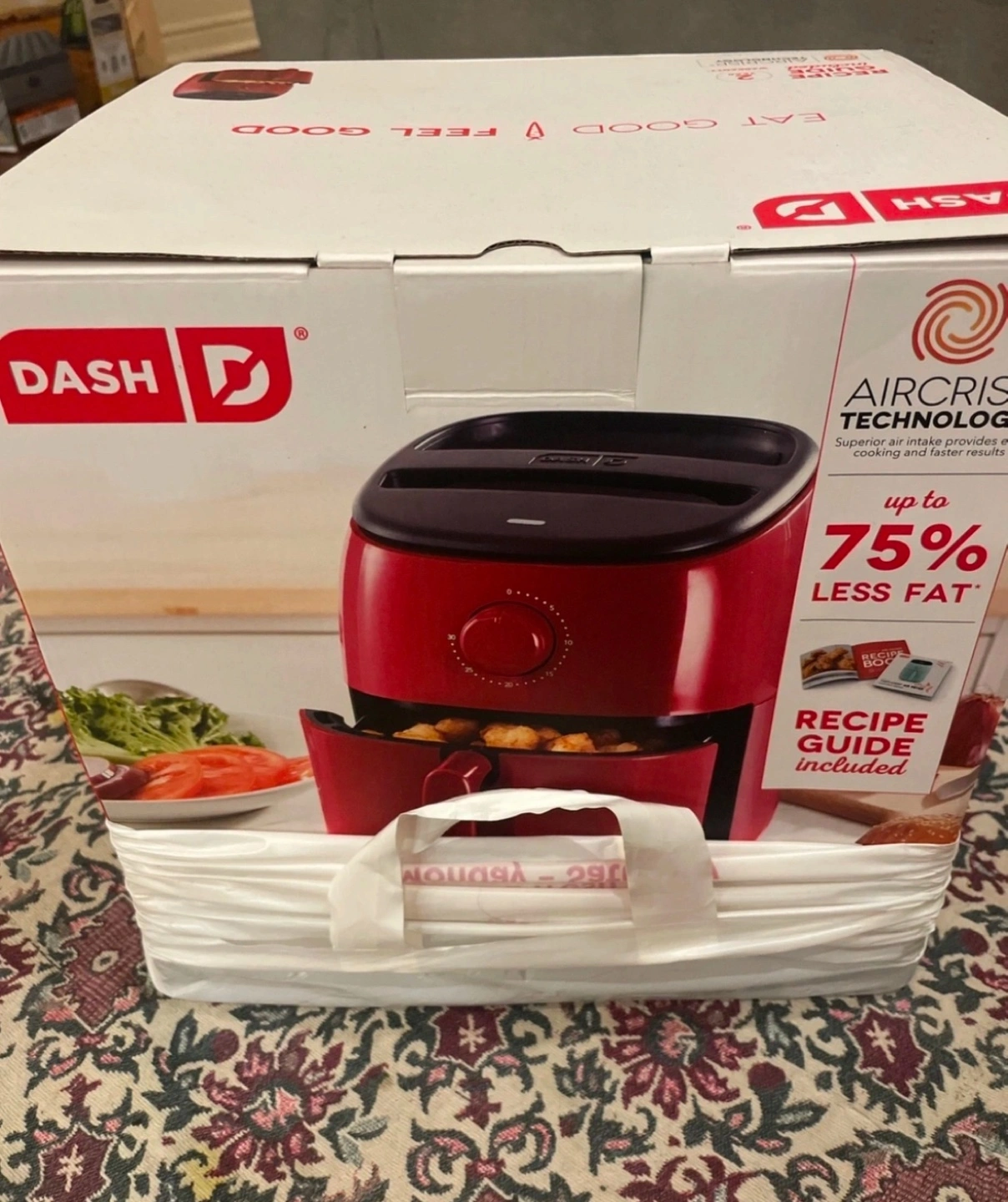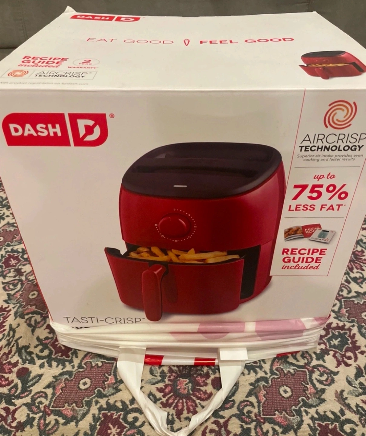 Red air fryer, unopened box. Features AirCrisp Technology. Up to 75% less fat. Recipe guide included.