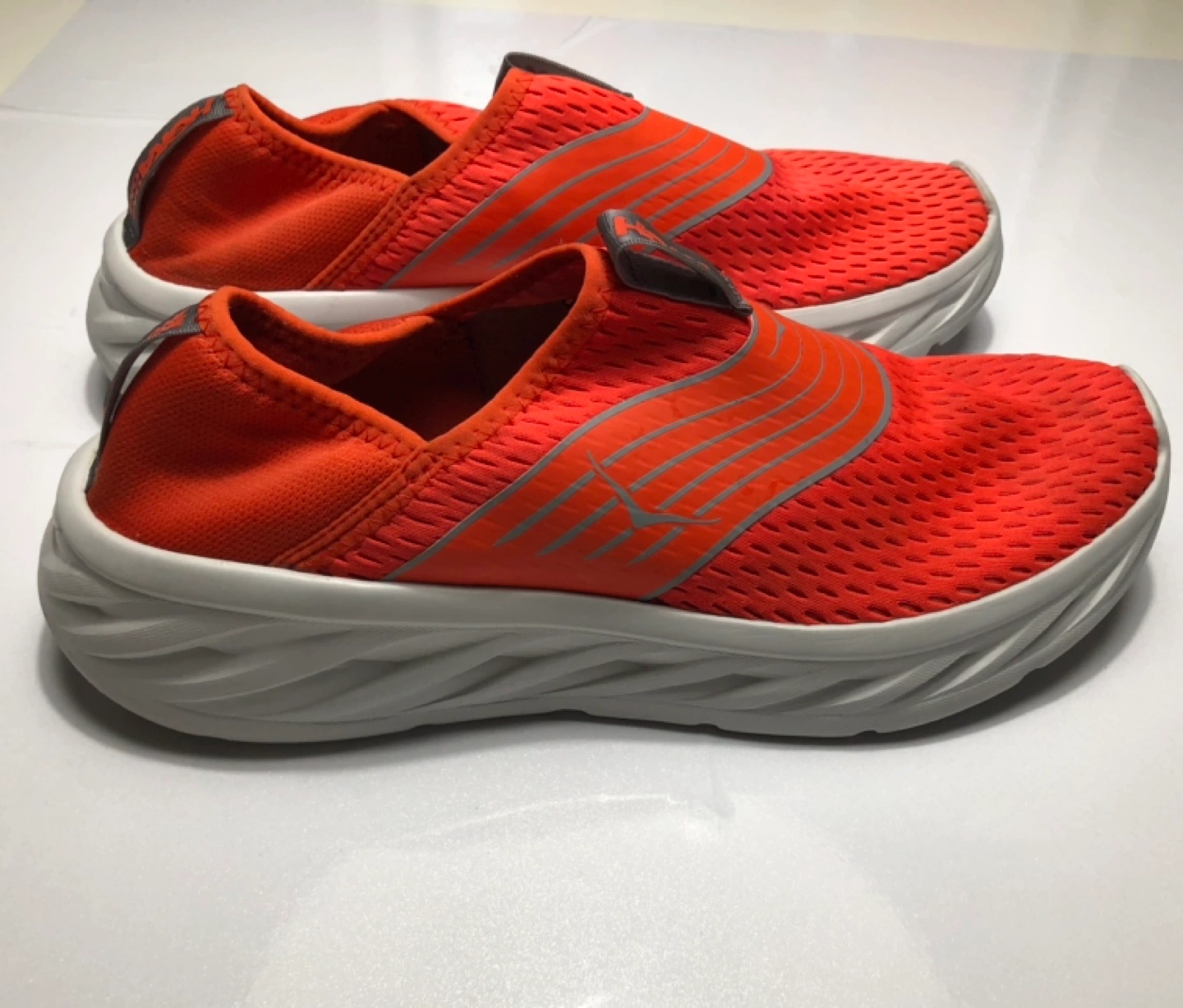 Men’s Ora Recovery Shoes in orange. Super plush and comfy, with bright mesh upper and foam cushioned sole. Excellent pre-loved condition.