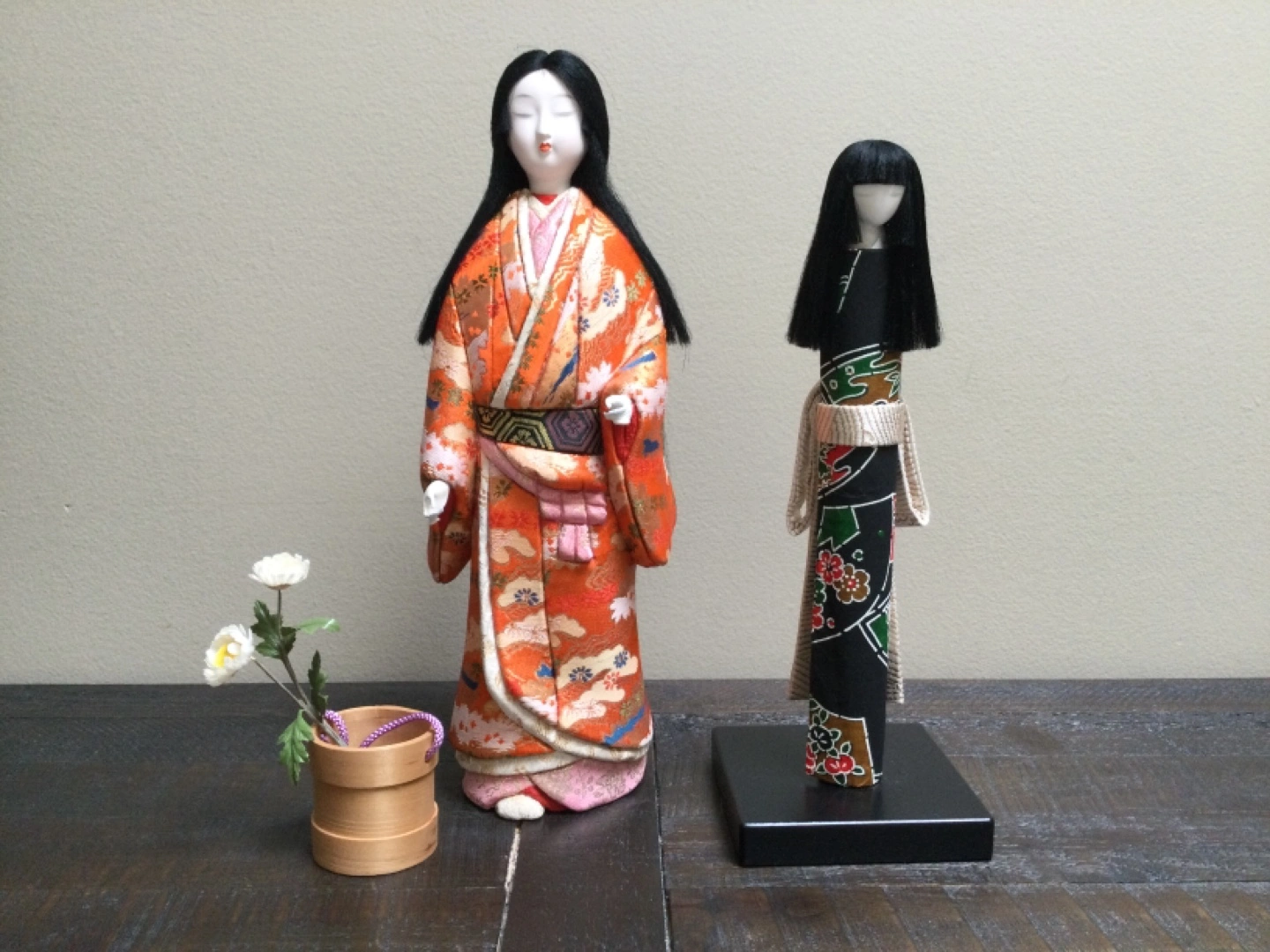 Vintage Japanese Kimekomi doll in good condition with light normal wear from age and handling. Her hair is in good but not perfect condition. She is 13" tall. No cracks in the face. Also include a girl Japanese kimono doll on stand, in good condition.