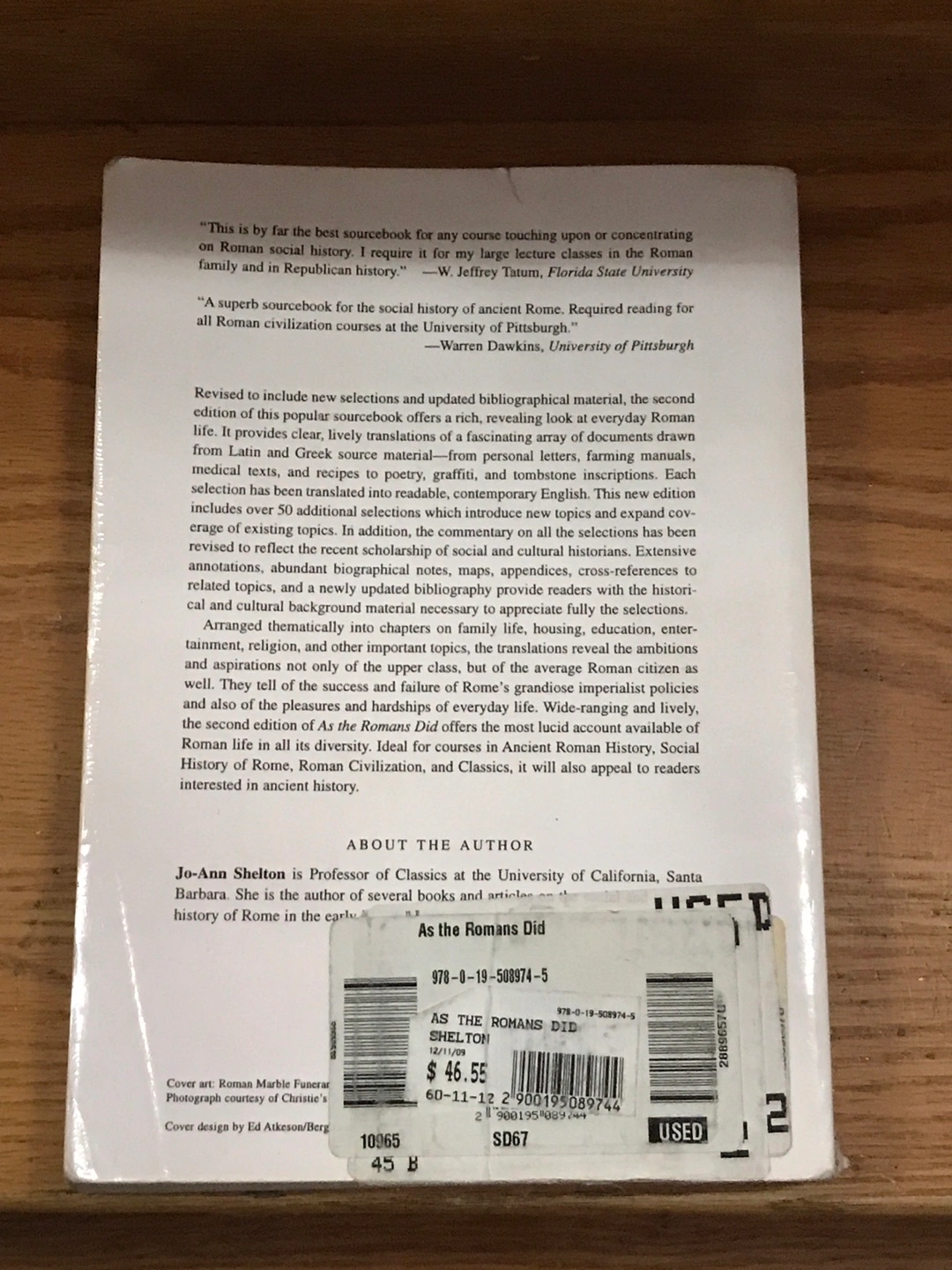 Second edition sourcebook. Provides source material from personal letters, farming manuals, and more. Covers everyday Roman life. Includes new selections, commentary on new topics, expanded bibliography, appendix, cross-references, and updated maps. Ideal for courses in Ancient Roman history, social history, and classics.