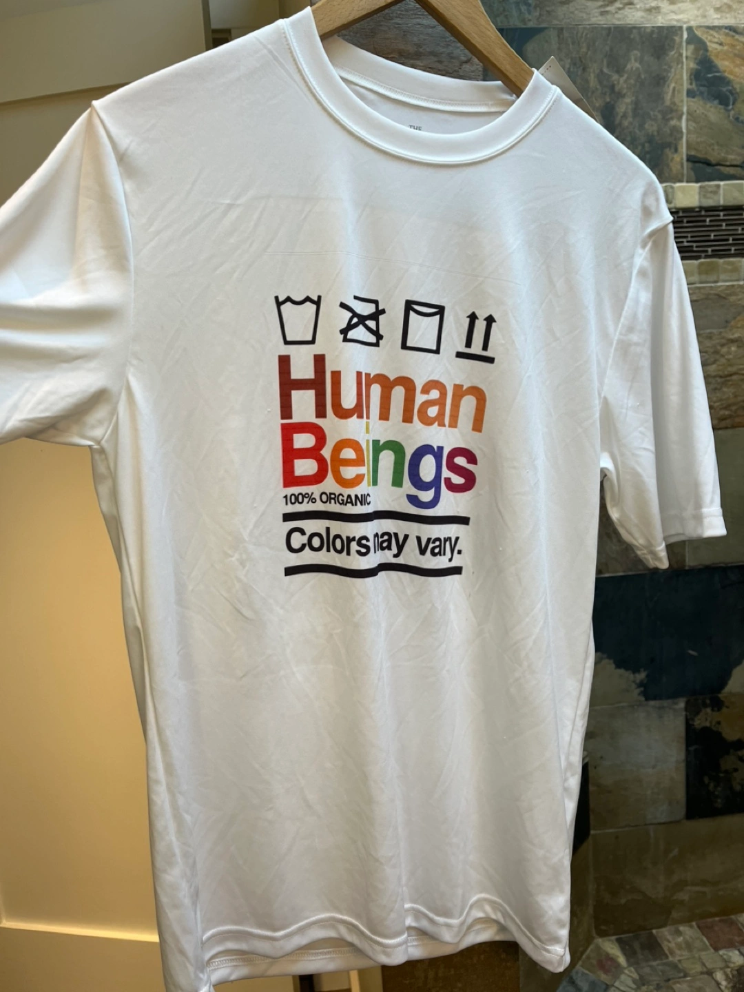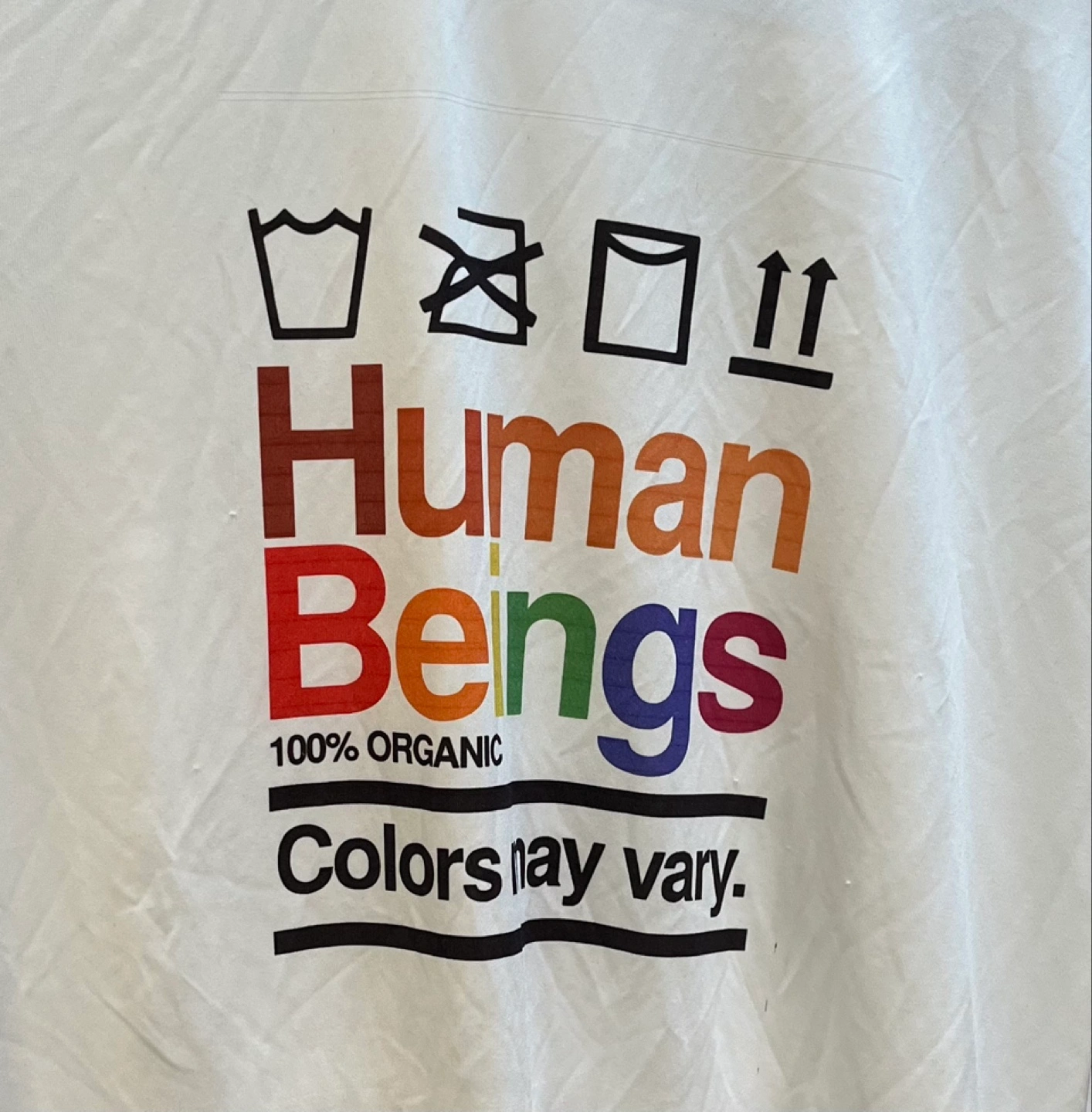 Brand new with tags, white short sleeve t-shirt. Features colourful Human Beings graphic on the front, saying “colours may vary”. 100% organic cotton. Size: Men's Large