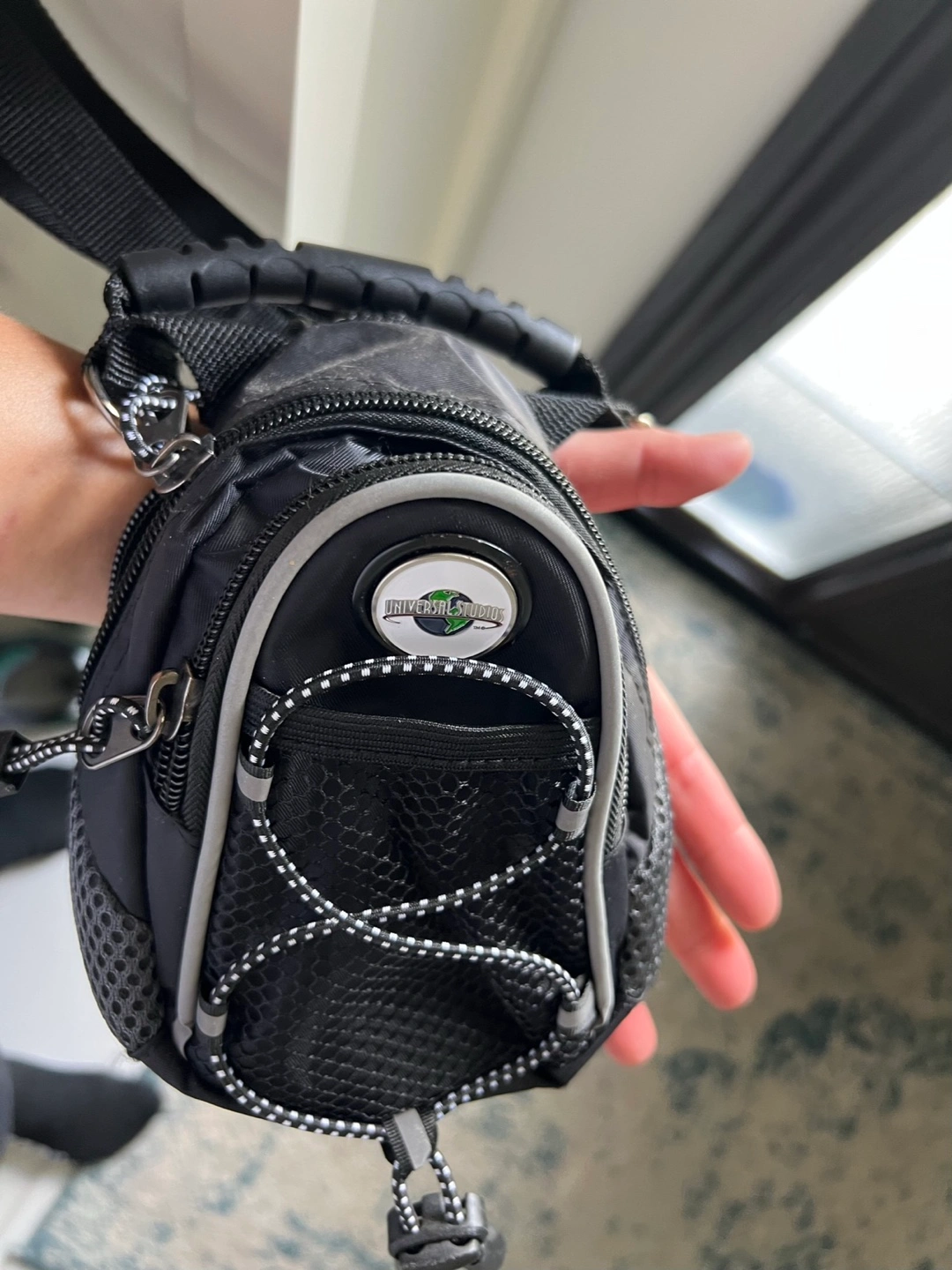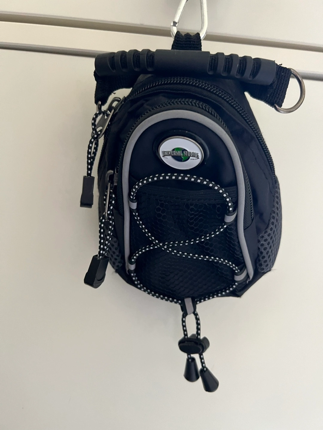 Tiny black backpack. Features a zipper closure, mesh pocket, and adjustable shoulder strap. Perfect for theme parks or everyday use. No real signs of wear to note.