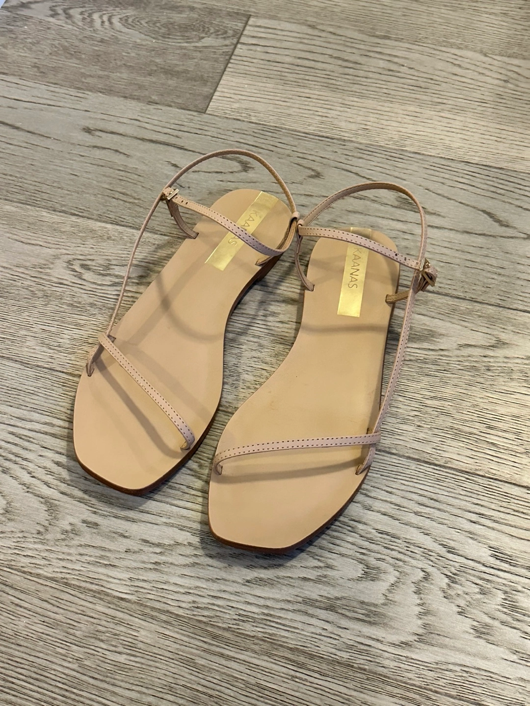259Open-toe minimalist beige leather sandals by Kaanas (RRP $175). Worn but in excellent condition. Comes with original box. Features: Adjustable buckle strap • Made in Brazil ✨From a pet-free & smoke-free home✨ Price negotiable. Cash only. Pick up at Lawrence Allen Mall