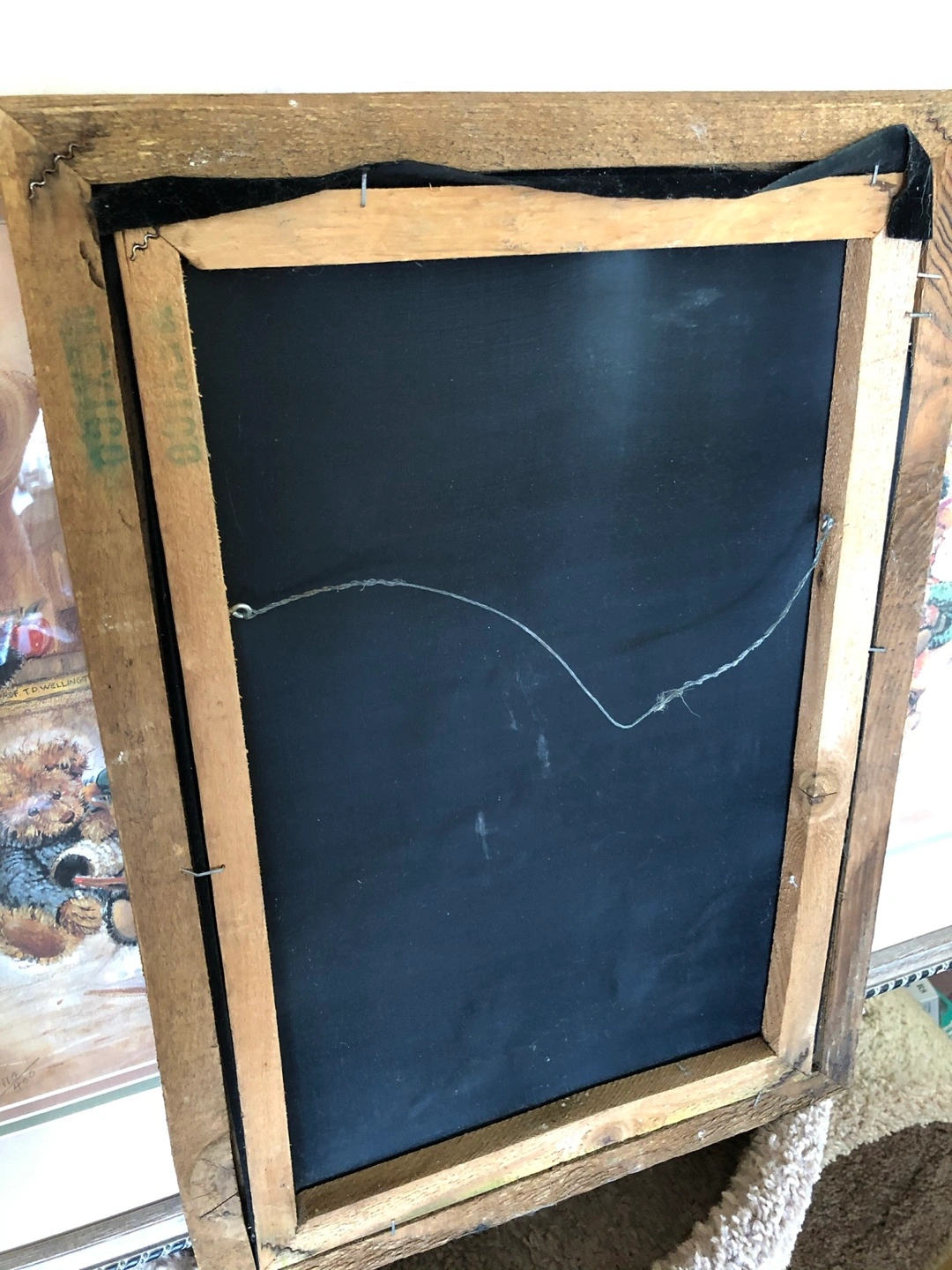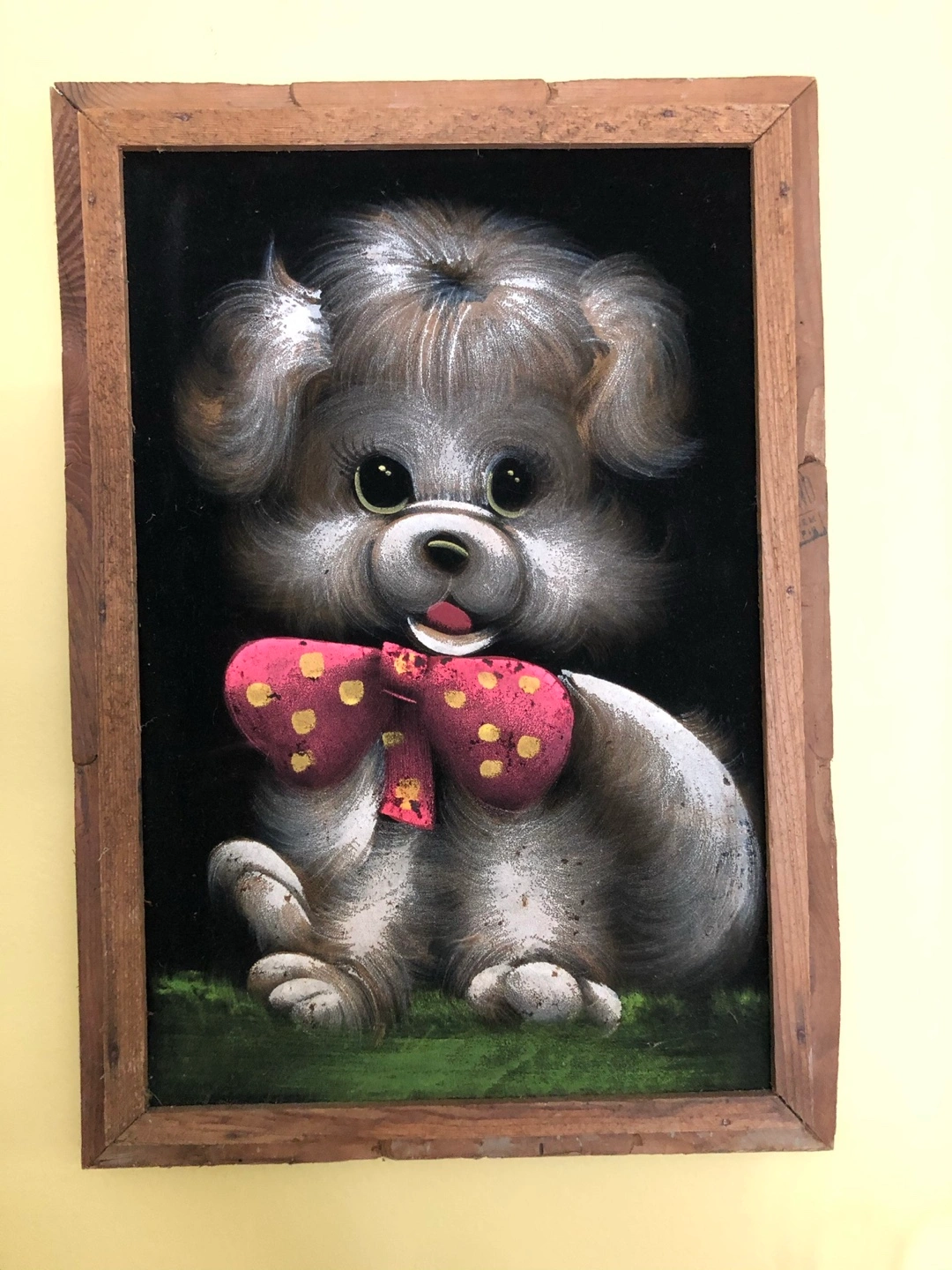 174Adorable vintage velvet painting. Features a cute puppy wearing a pink polka dot bow tie. Wooden frame. Great for collectors of vintage art or animal-themed decor.