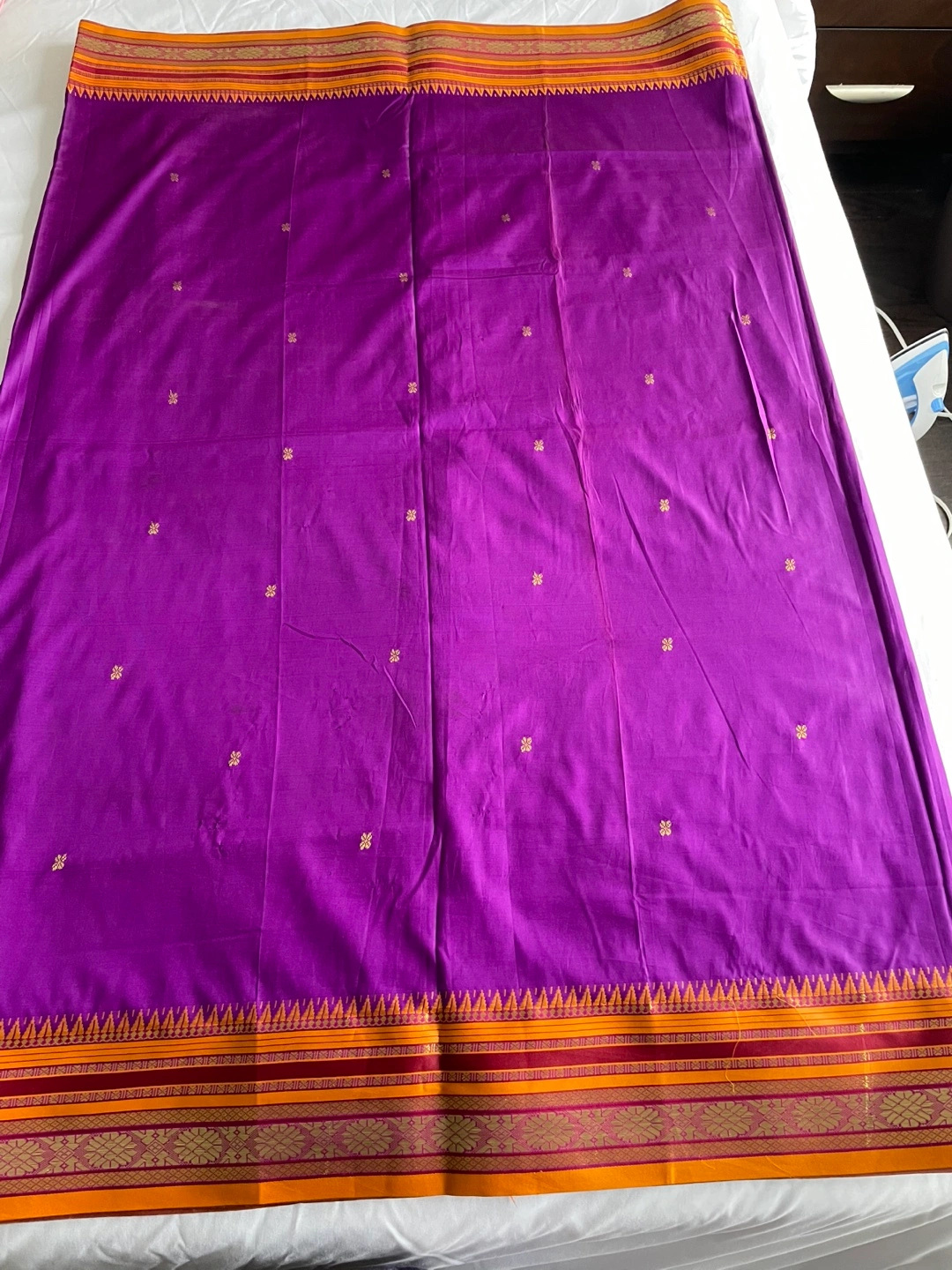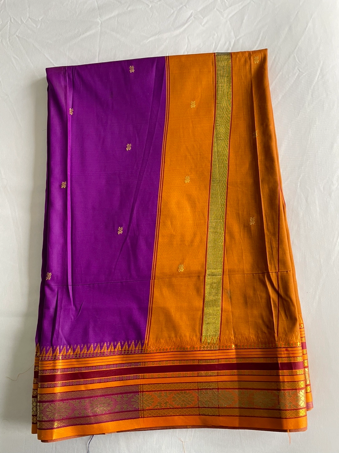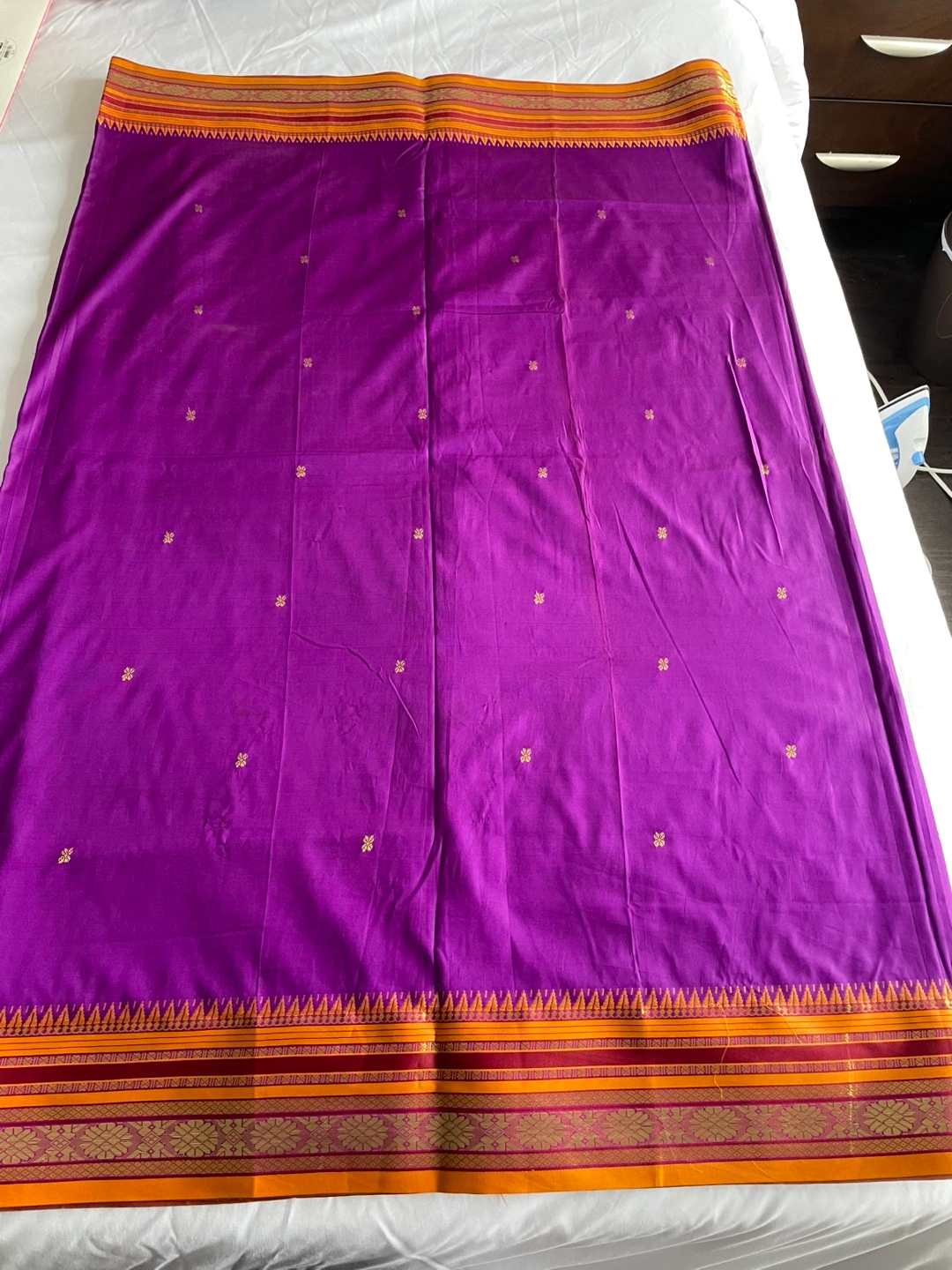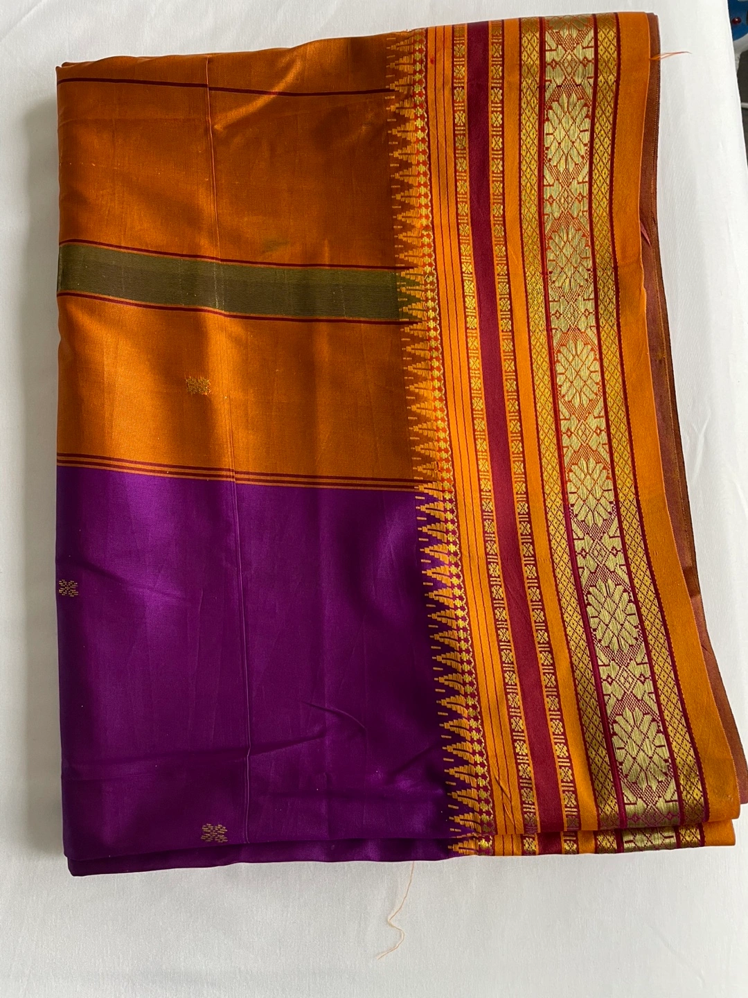 Gorgeous purple and gold handloom silk saree. Features intricate detailing and a rich colour palette. Suitable for special occasions. Unworn, excellent condition.