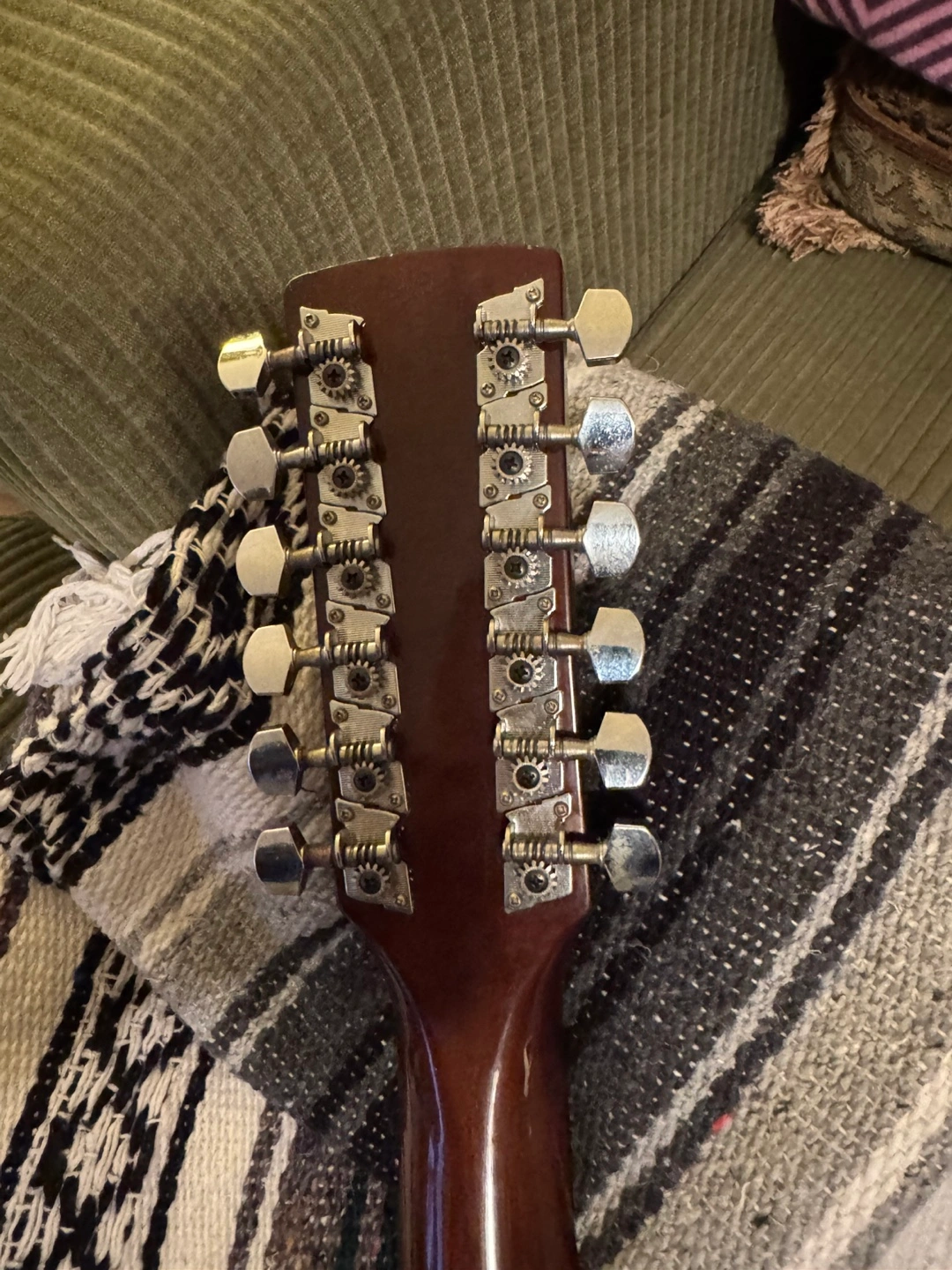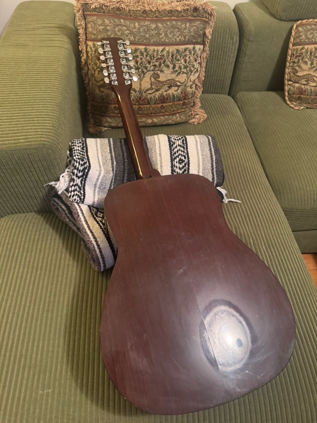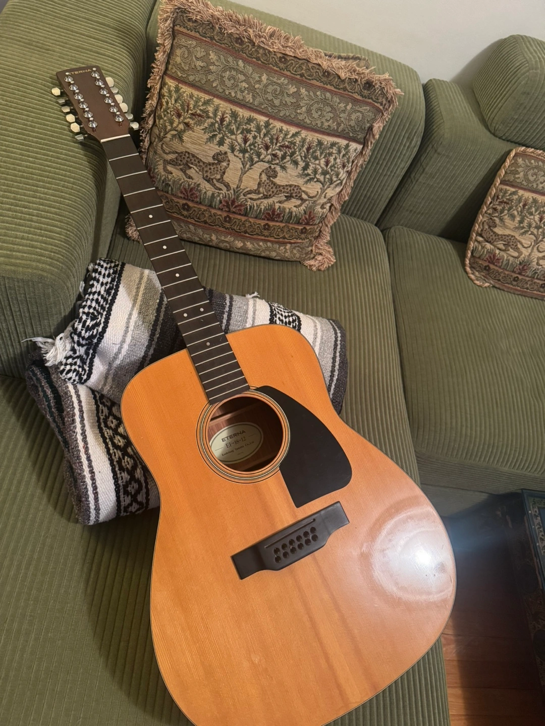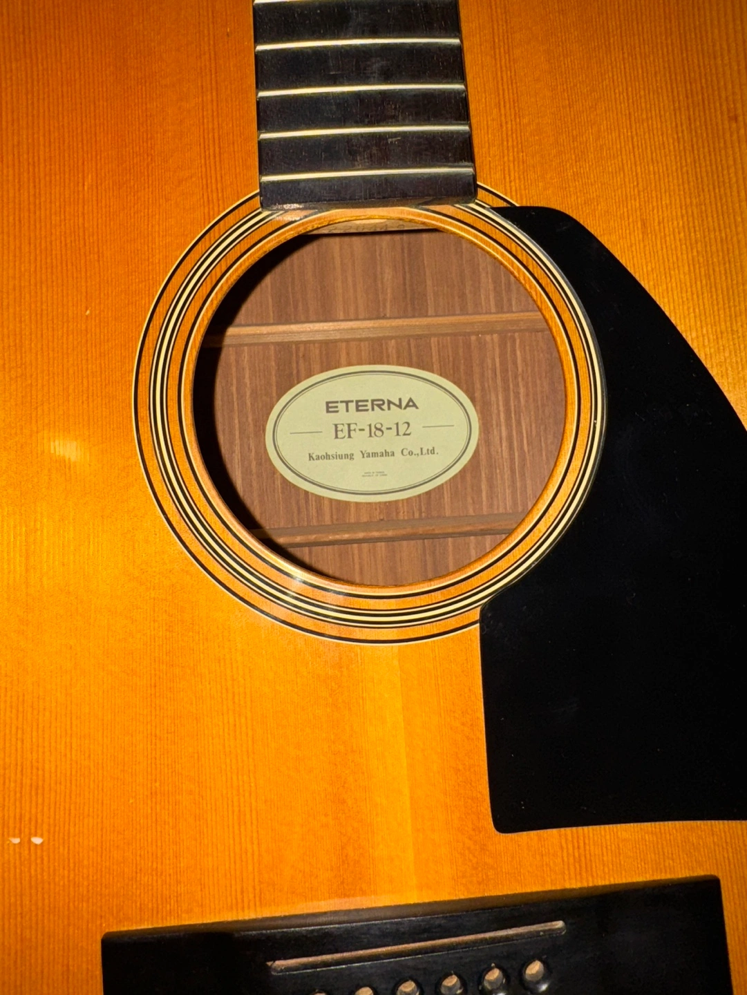Vintage Eterna 12-string acoustic guitar. Model EF-18-12. Kaohsiung Yamaha Co., Ltd. Some wear and tear. Missing strings no structural damage. Good for players or collectors.