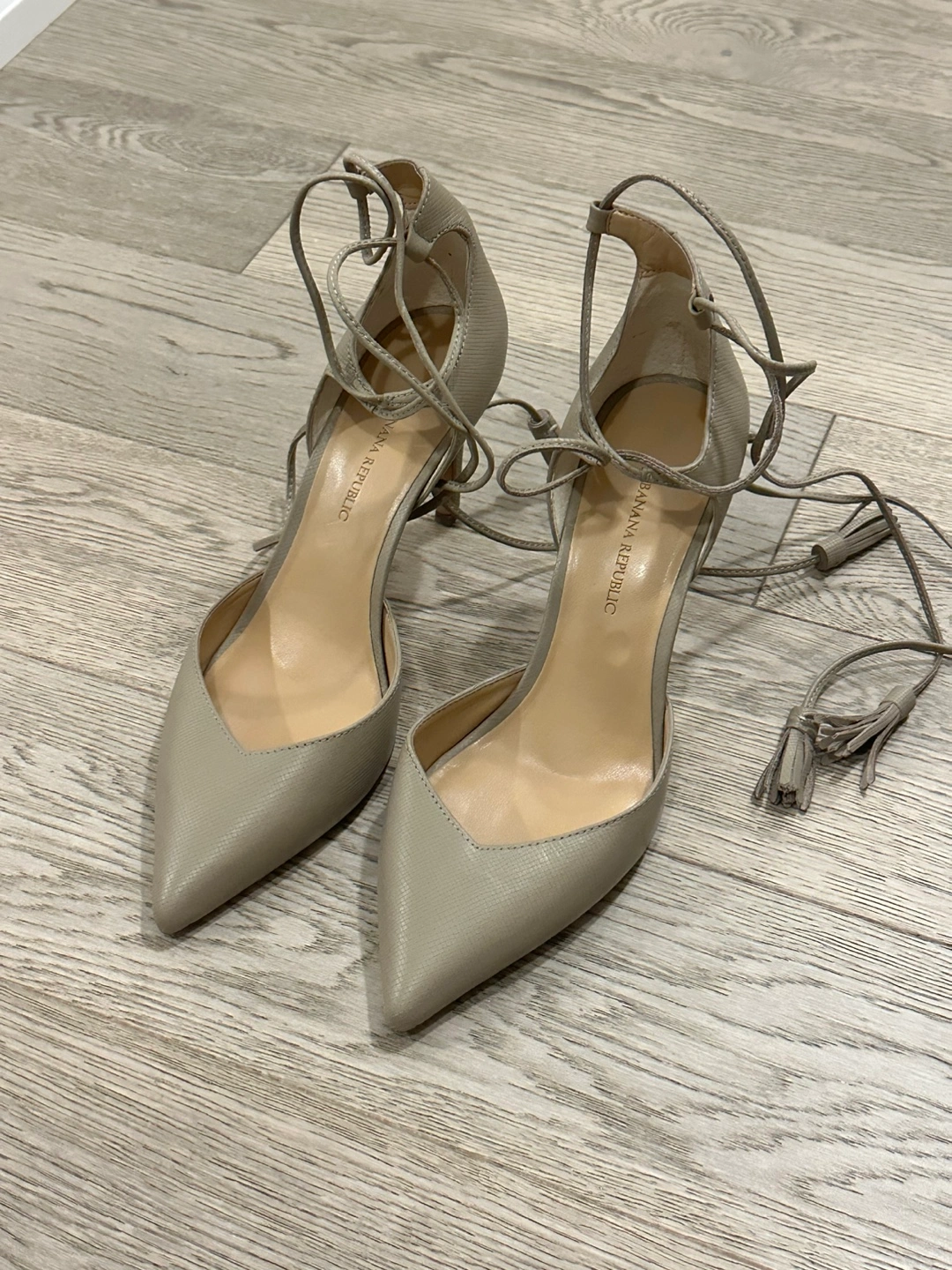 Taupe leather ankle-tie heels with tassels by Banana Republic. Worn but in excellent condition.