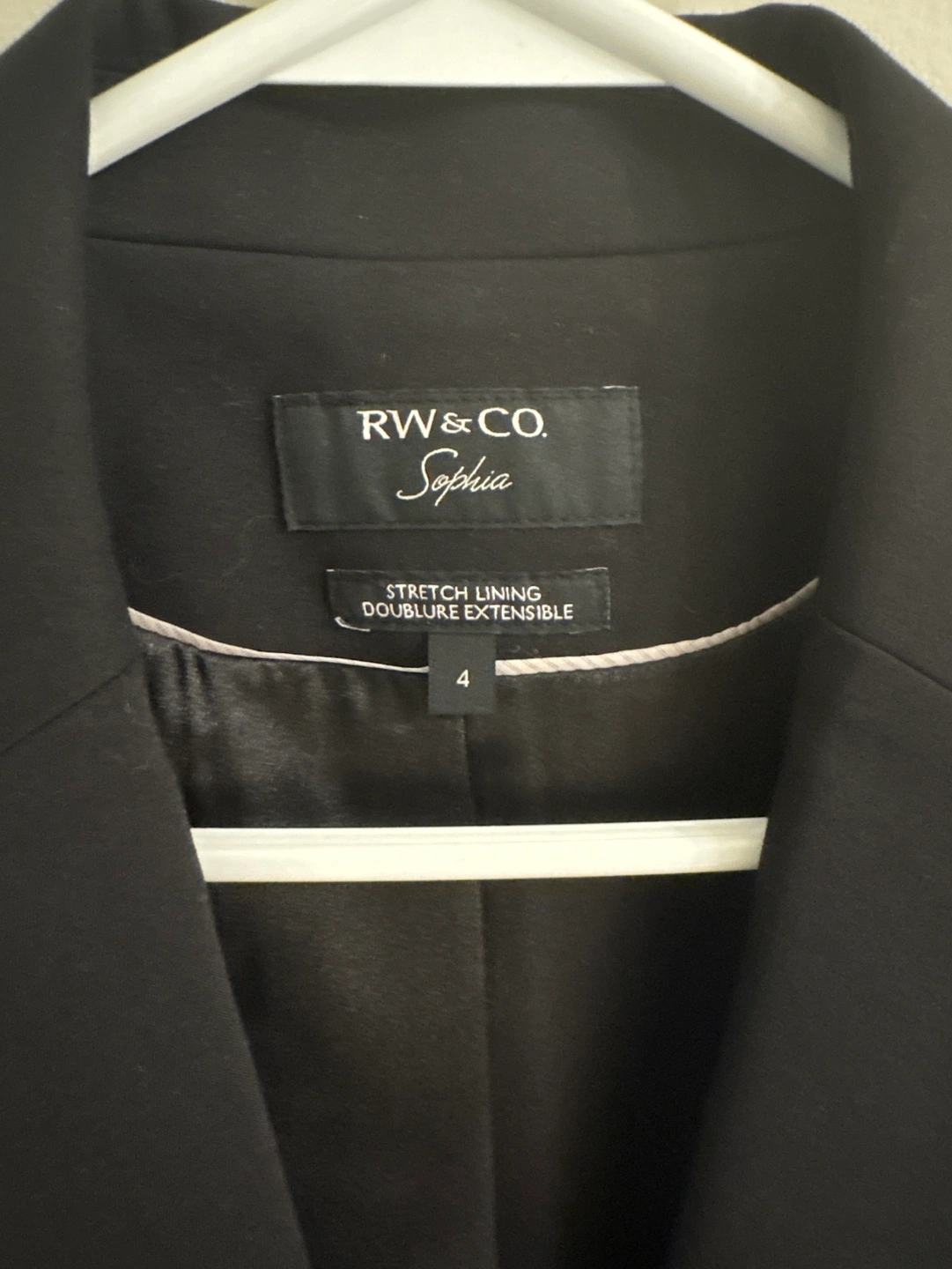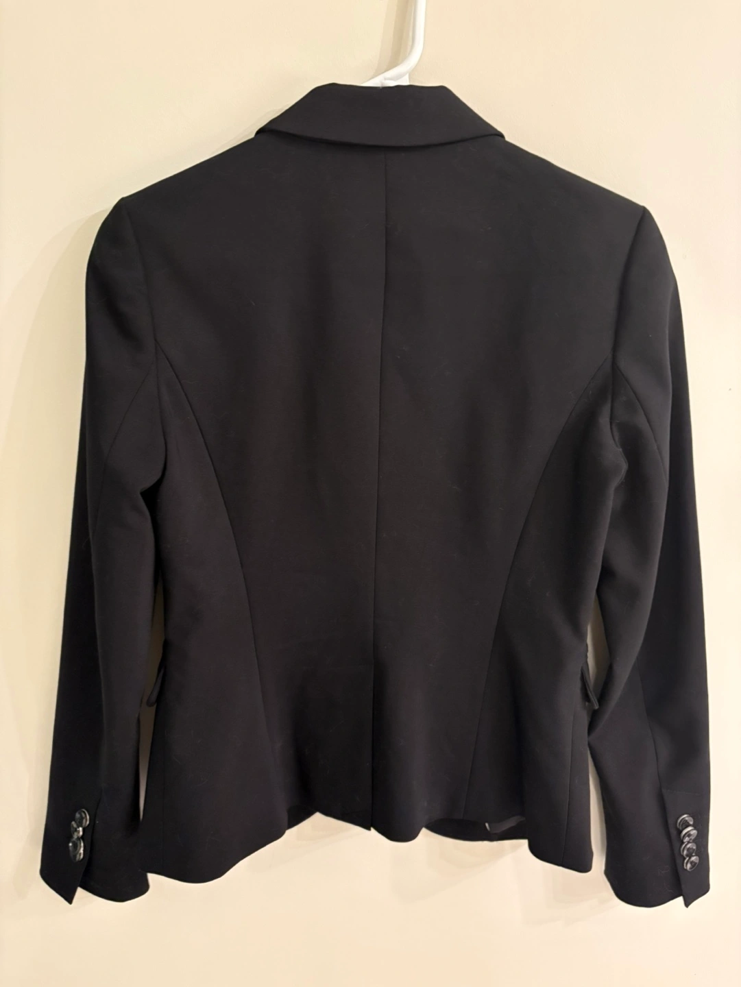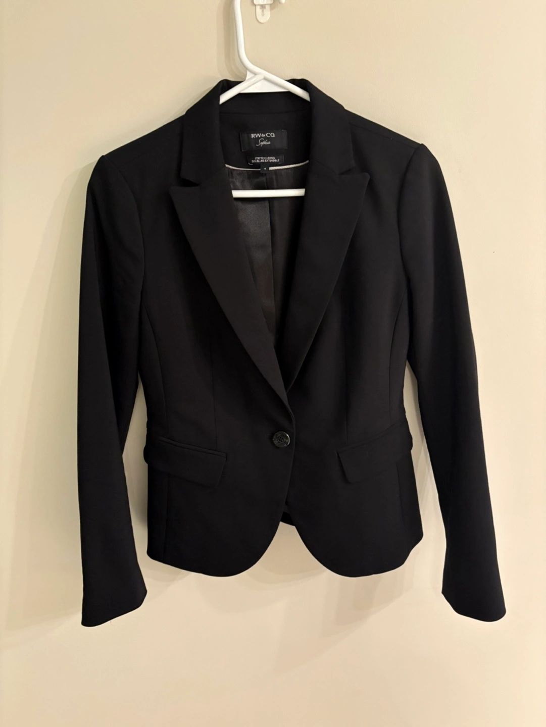 Women's black blazer. Size 4. Single button closure. Stretch lining. Long sleeves. Classic style. Great for work or special occasions.