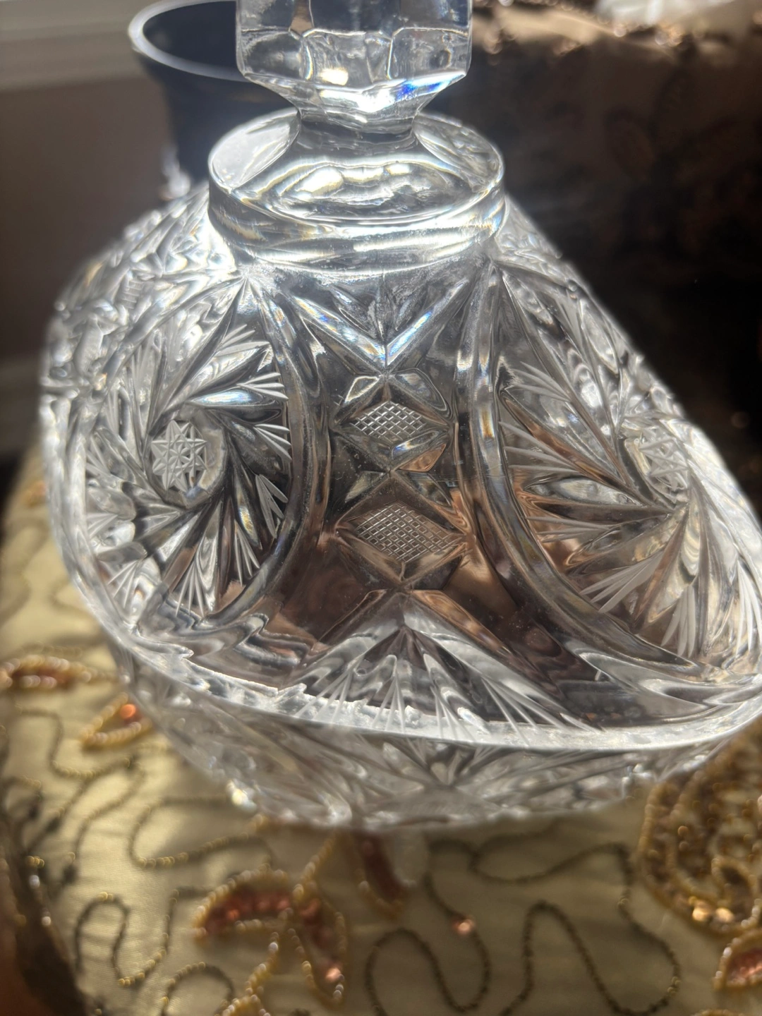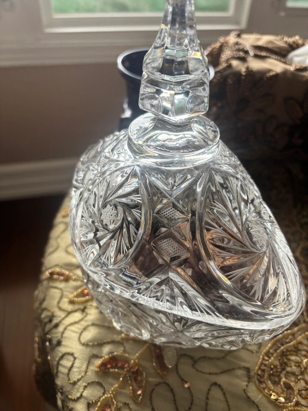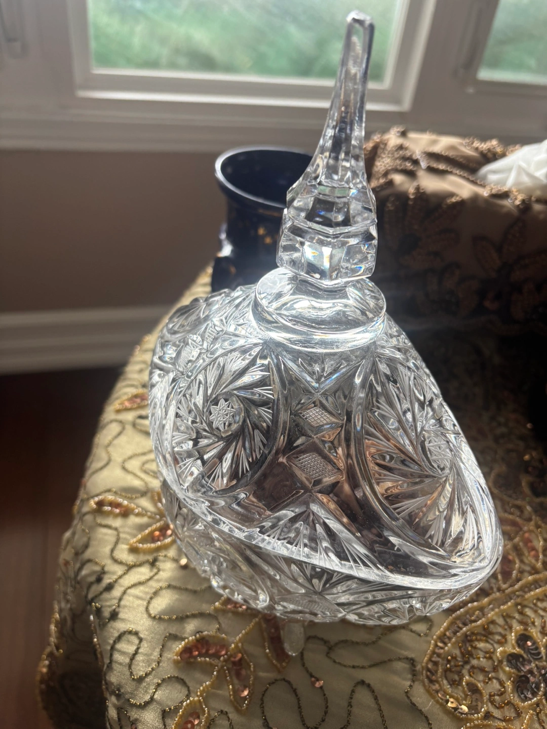 33Beautiful vintage crystal candy dish. Intricate cut glass design. Oval shape with a finial-topped lid. Perfect for candy, trinkets, or display.