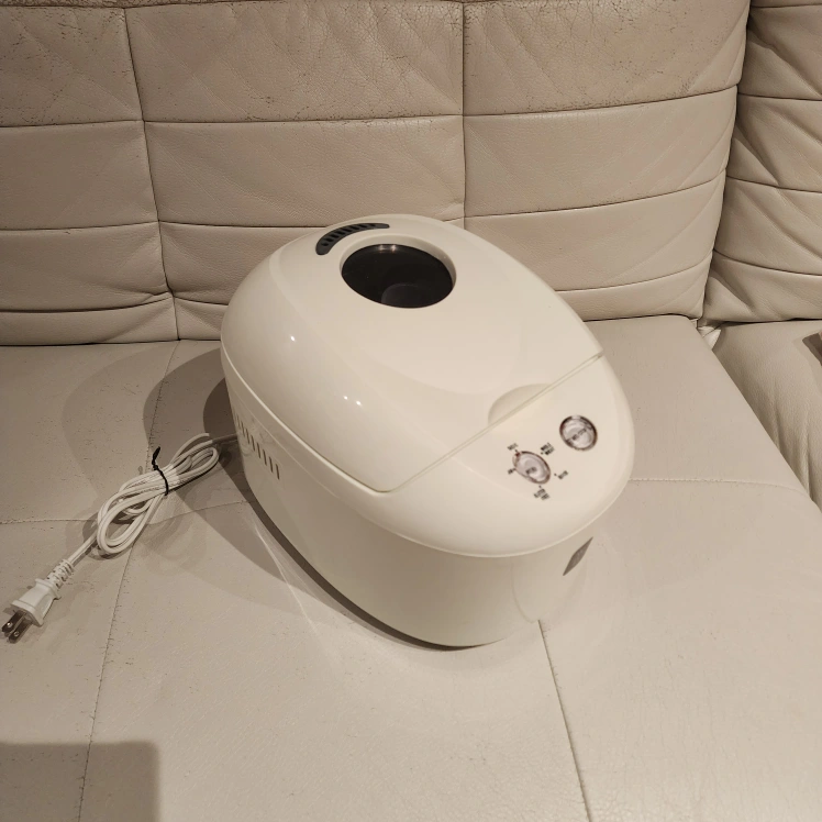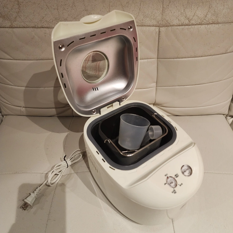 White breadmaker. Includes measuring cup. Household use only. Made in China.