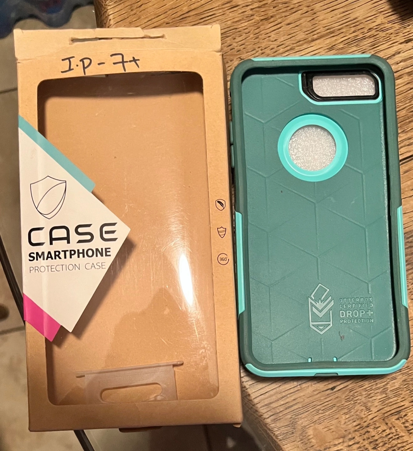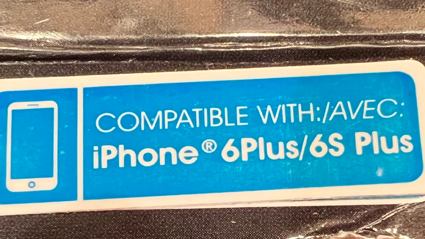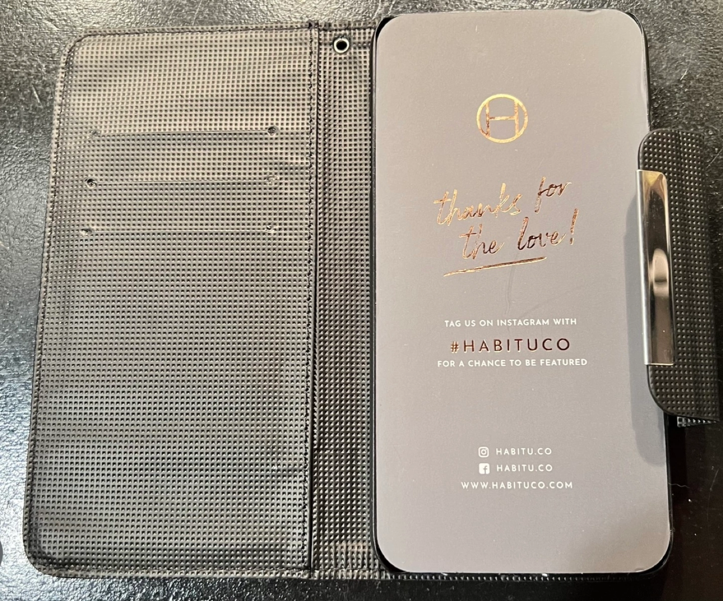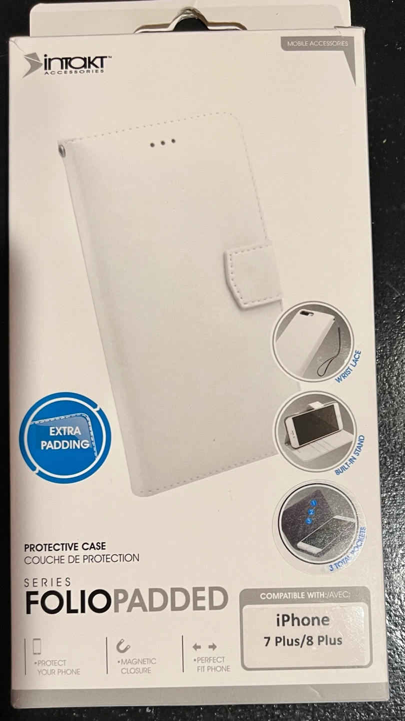 Black leather folio case. Compatible with iPhone 6 Plus and 6S Plus models. Features magnetic closure and extra padding. Includes card slots and wrist strap.
