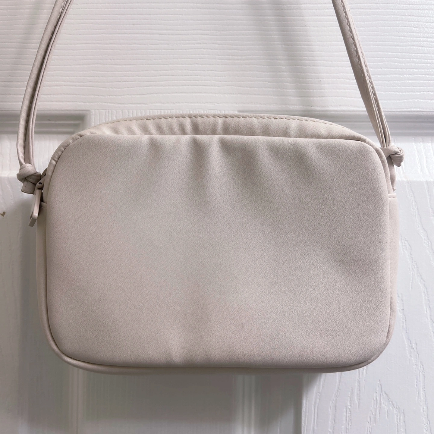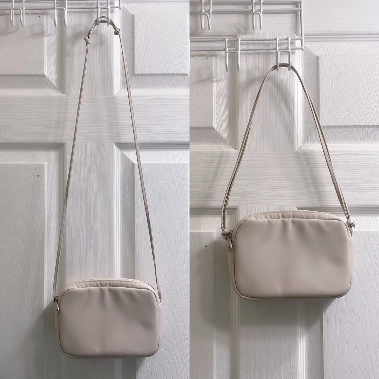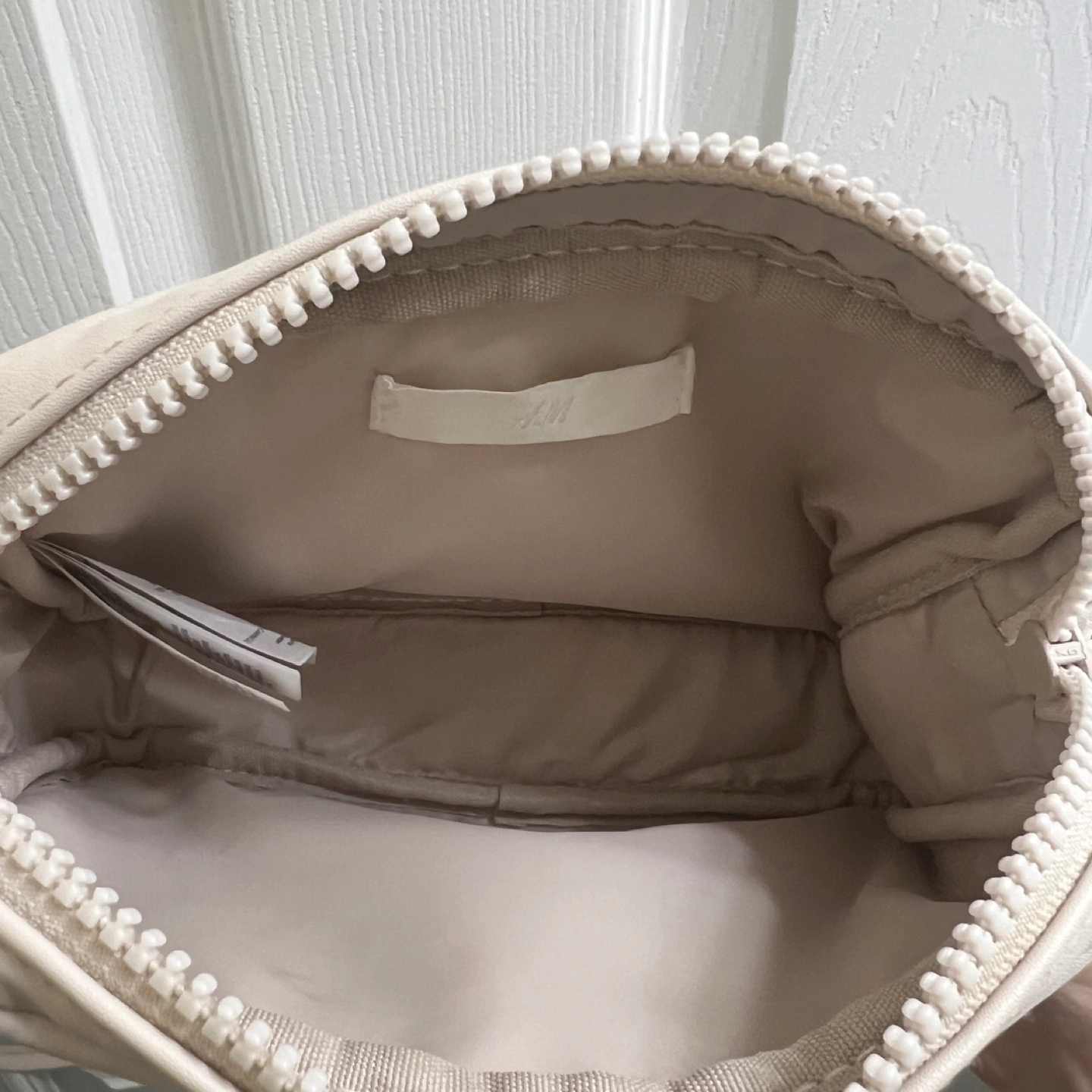 This cream crossbody bag from H&M features a compact rectangular shape and a faux leather material. It includes a thin adjustable shoulder strap and a secure zipper closure, making it ideal for carrying your essentials in style.