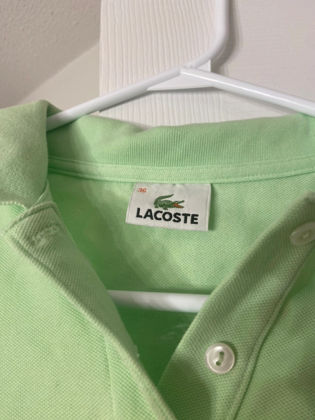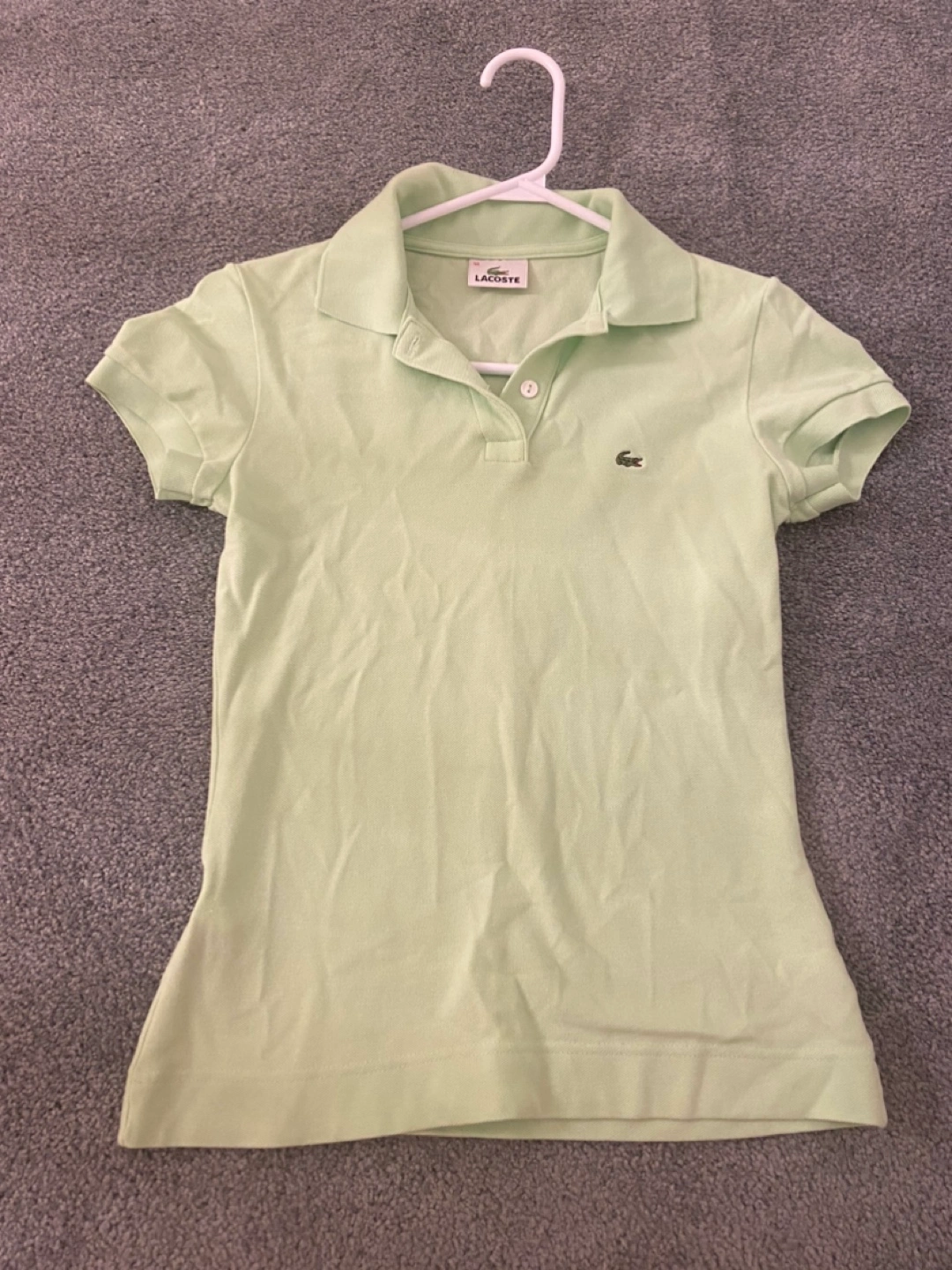 Light green Lacoste women's polo shirt. Size 36. Short sleeves. Classic fit. Button closure. Worn only a couple times, itβs a bit small on me. No flaws, just a little wrinkled.