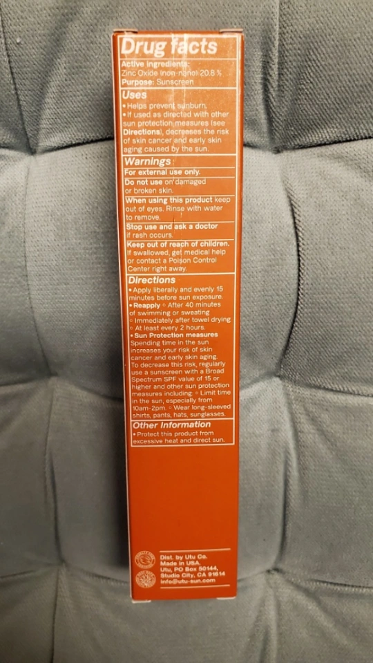 Broad spectrum sunscreen. Mineral Zinc Oxide. Water resistant 40min. Unscented. Contains hyaluronic acid, buckthorn, sesame seed oil, vitamin C&E, astaxanthin, aloe. 2.5 fl oz/75ml