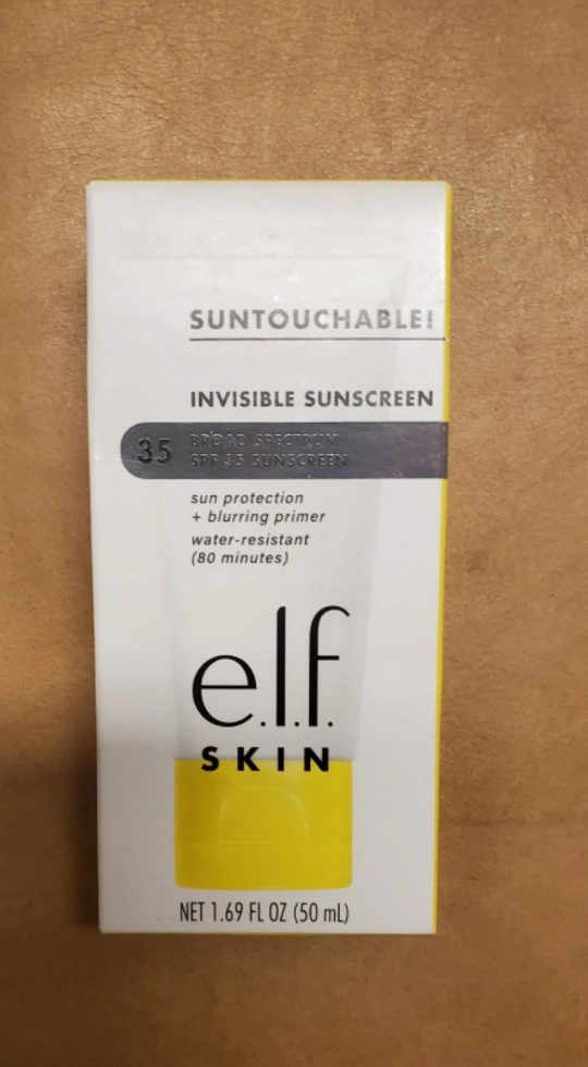 New, unopened box of e.l.f. Skin Suntouchable! Invisible Sunscreen SPF 35. Broad spectrum, sun protection plus blurring primer. Water-resistant (80 minutes). Net 1.69 fl oz (50 ml).