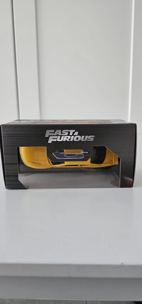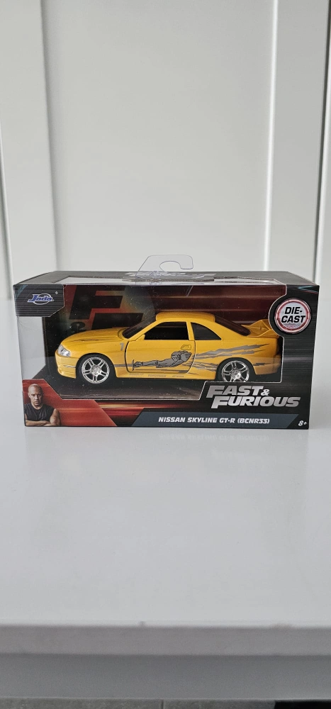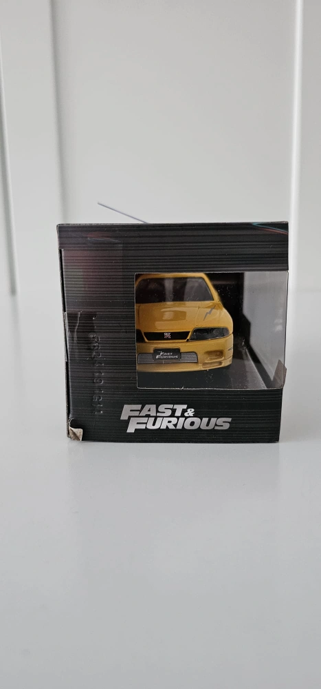 Collectible die-cast model car. Yellow Nissan Skyline GT-R (R32) from the Fast & Furious franchise. New in box. Detailed design. Great for collectors or enthusiasts.