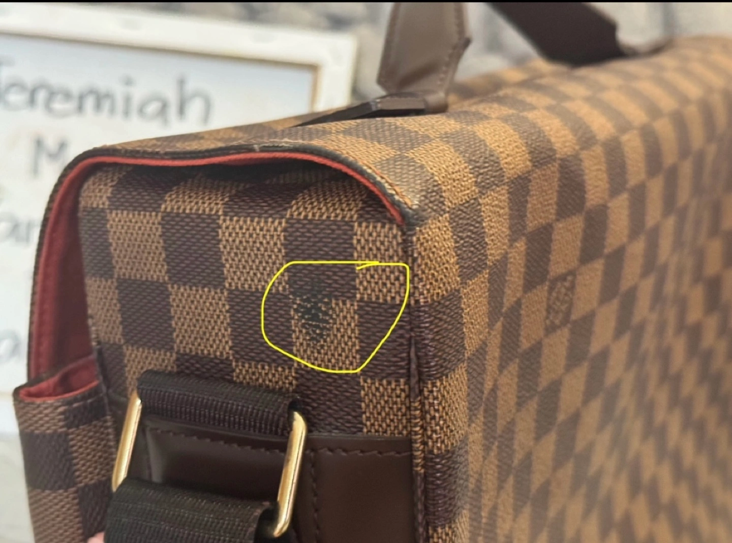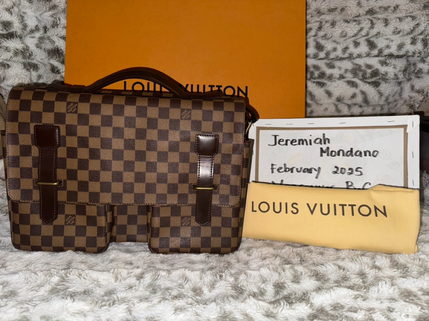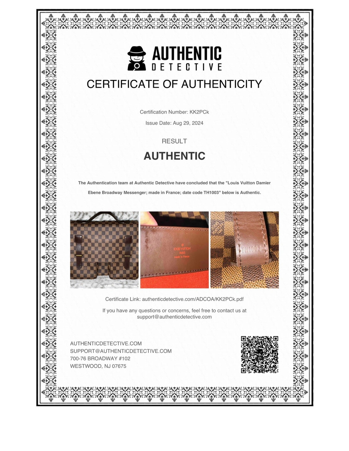 Authentic Louis Vuitton messenger bag. Damier Ebene canvas exterior. Brown leather trim. Multiple compartments. Adjustable shoulder strap. Made in France.