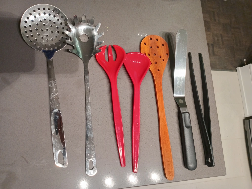 Set of six kitchen utensils. Includes slotted spoon, pasta server, two silicone spoons, wooden slotted spoon and a spatula. Good used condition.