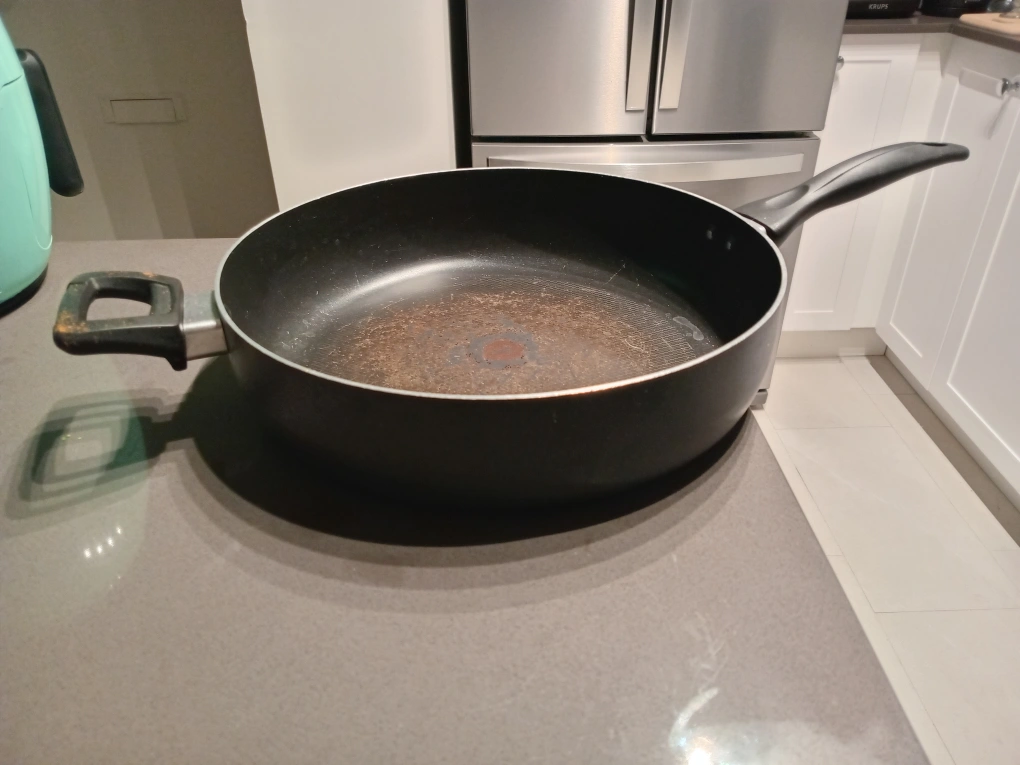 Large, round frying pan. Non-stick surface. Shows some signs of use. Features a long handle and a small helper handle.