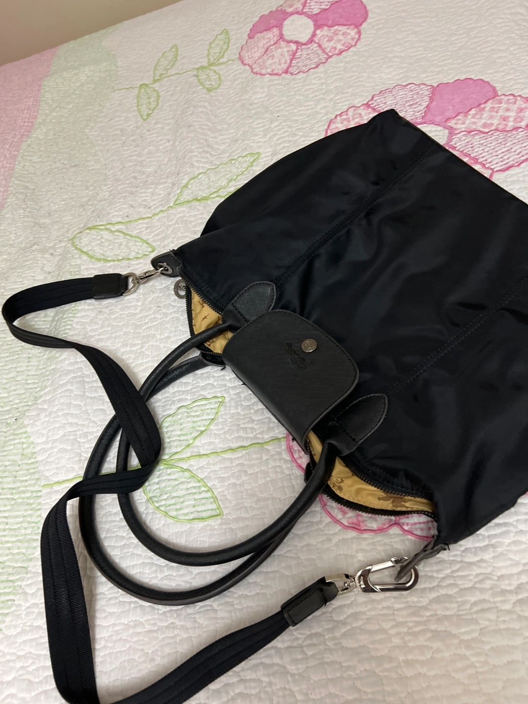 Black nylon tote bag. Features two top handles and a detachable shoulder strap. Interior features a beige lining with a horse print. Snap closure. Excellent pre-owned condition.