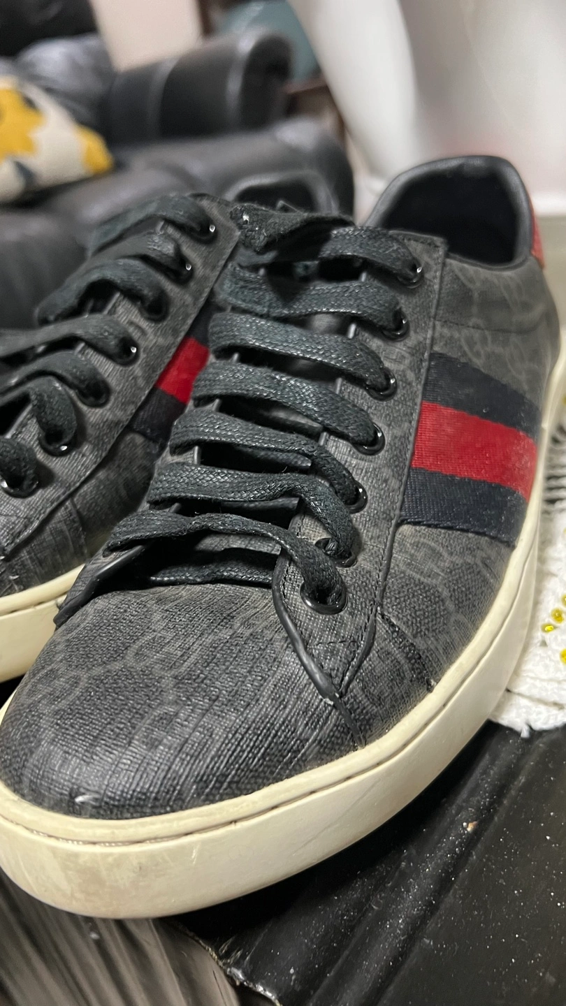 Men size 38 Pre -owned Authentic Gucci Ace sneakers. Black GG canvas with red and blue web stripe detail. Leather accents. Lace-up closure. Low-top style. Made in Italy