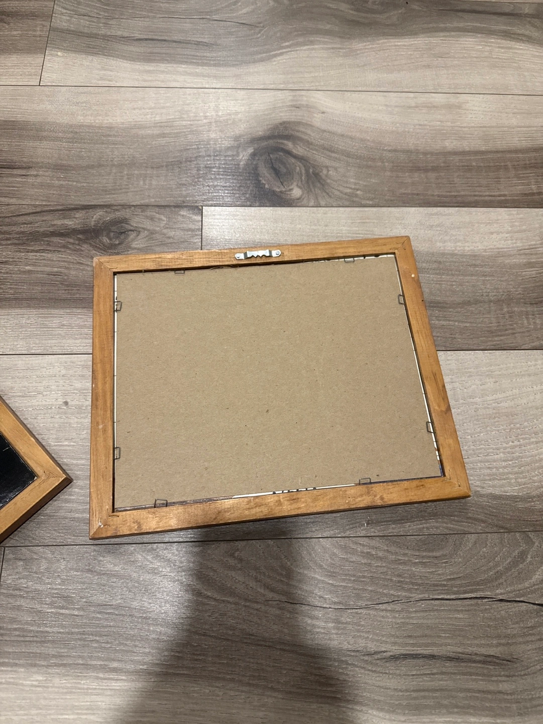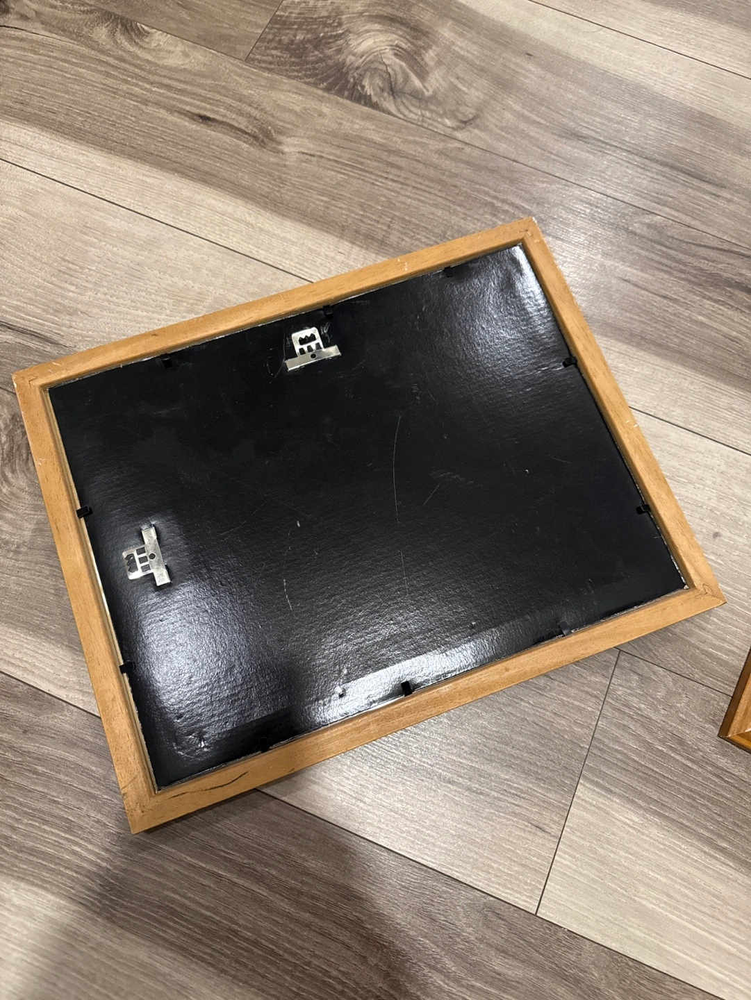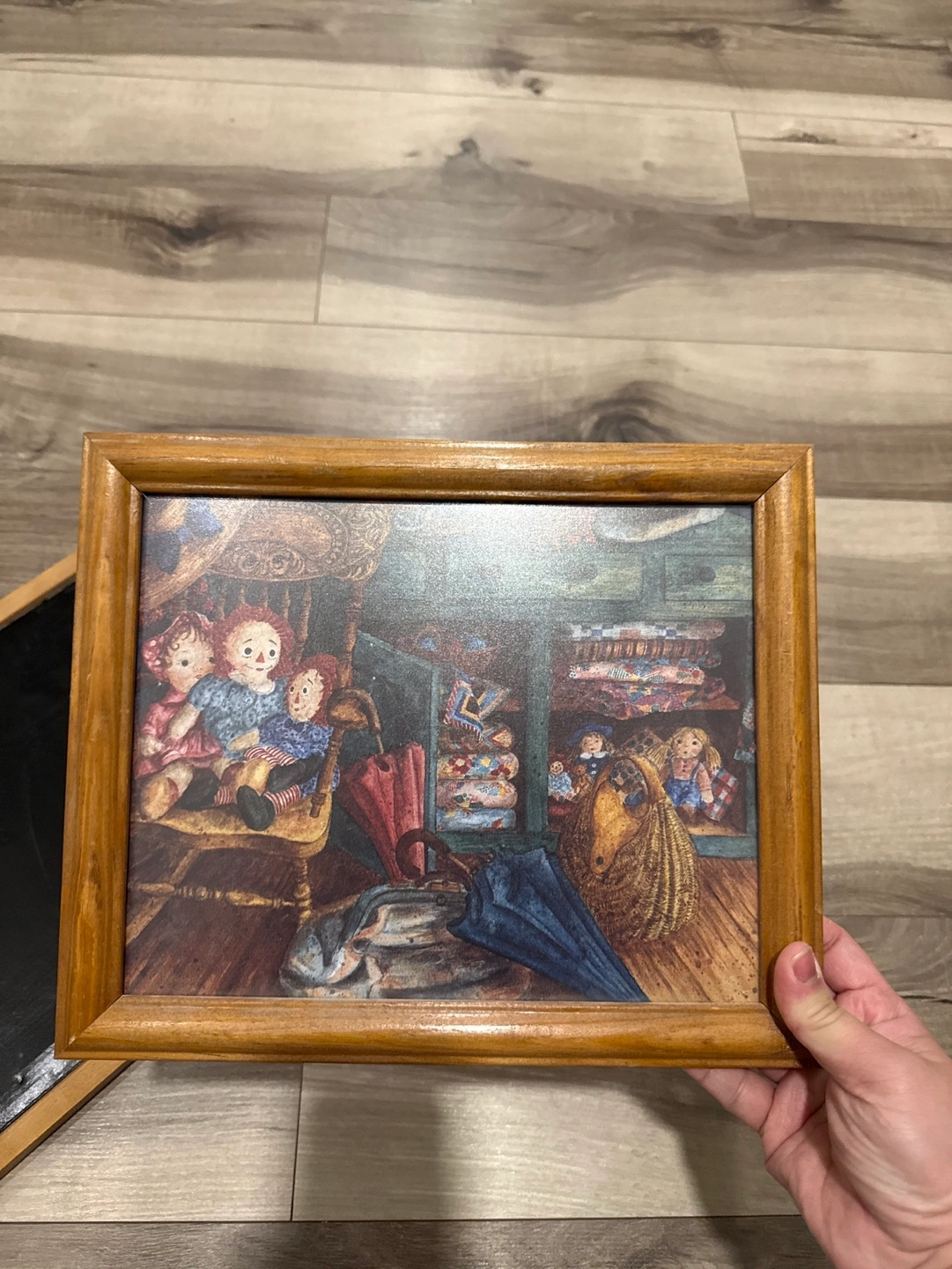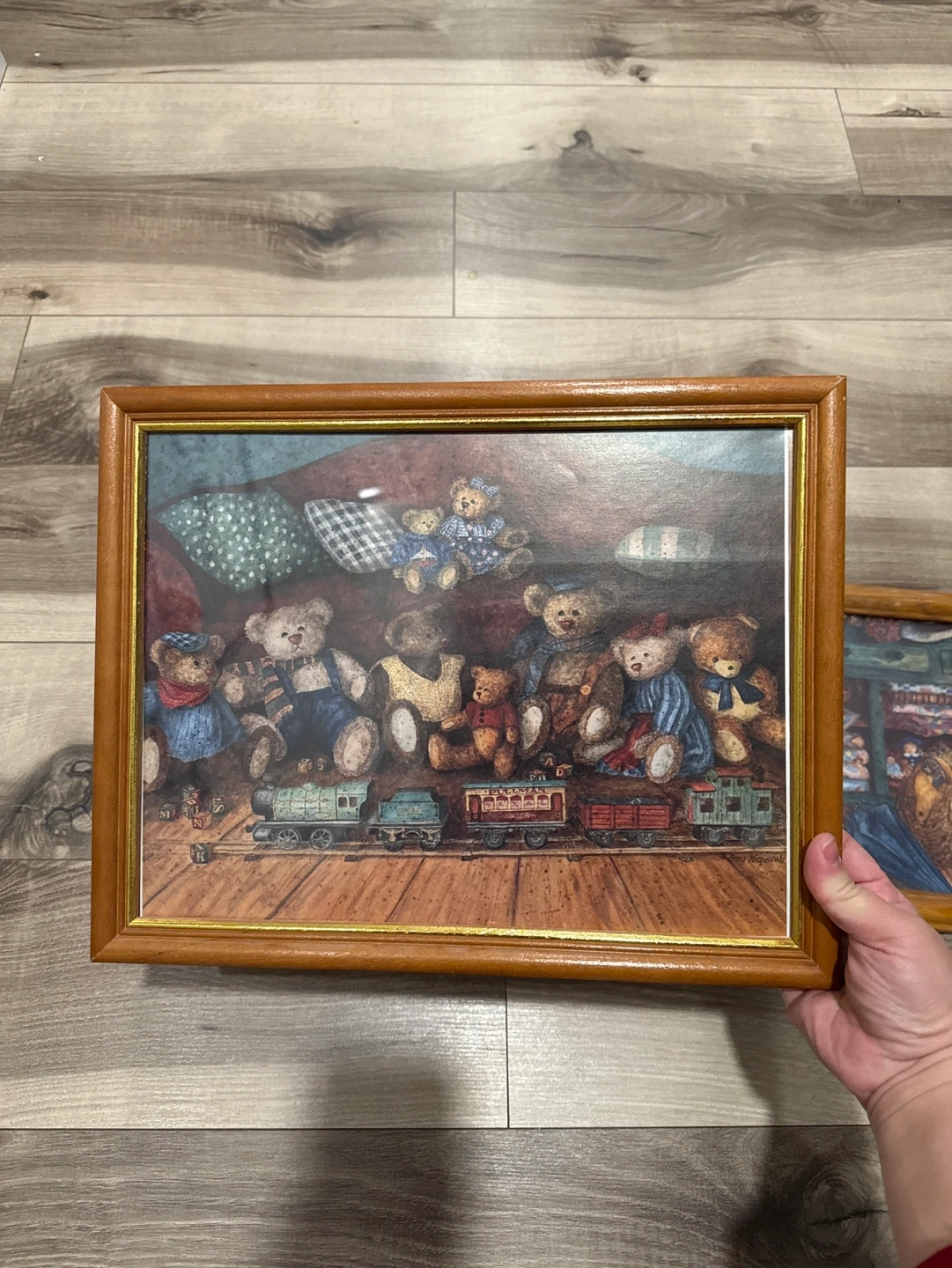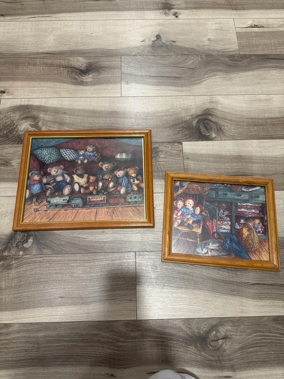 Two framed pictures. One features teddy bears with a toy train. The other shows rag dolls in a room. Wooden frames. Cute vintage style. Cute for a Nursery room or Kids’ playroom.