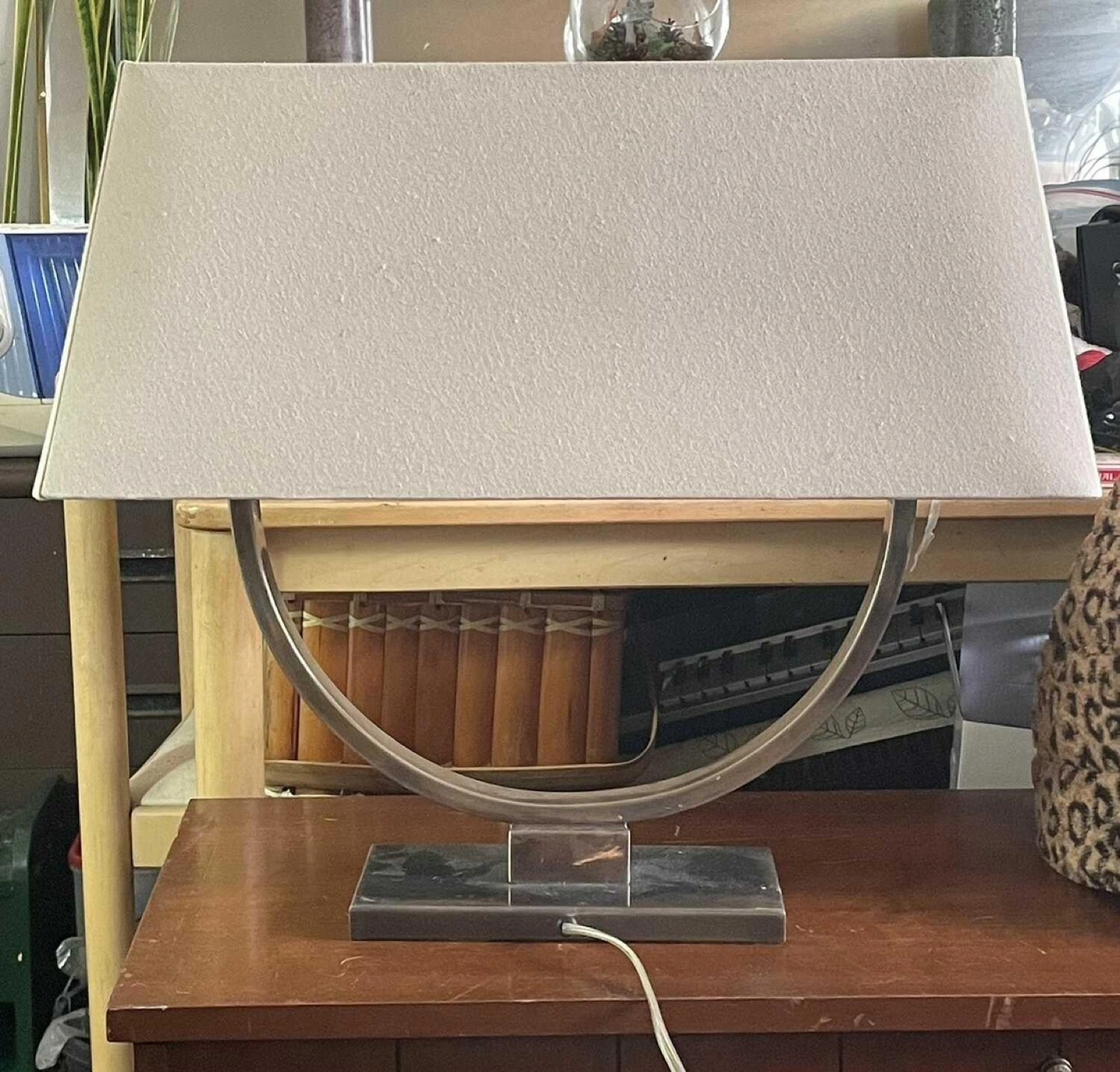 Double LED bulb lamp with brushed chrome base & beige fabric shade. On/off switch on cord. Shade at widest point is 24” x 9” x 10” | gives great light | pic doesn’t do it justice