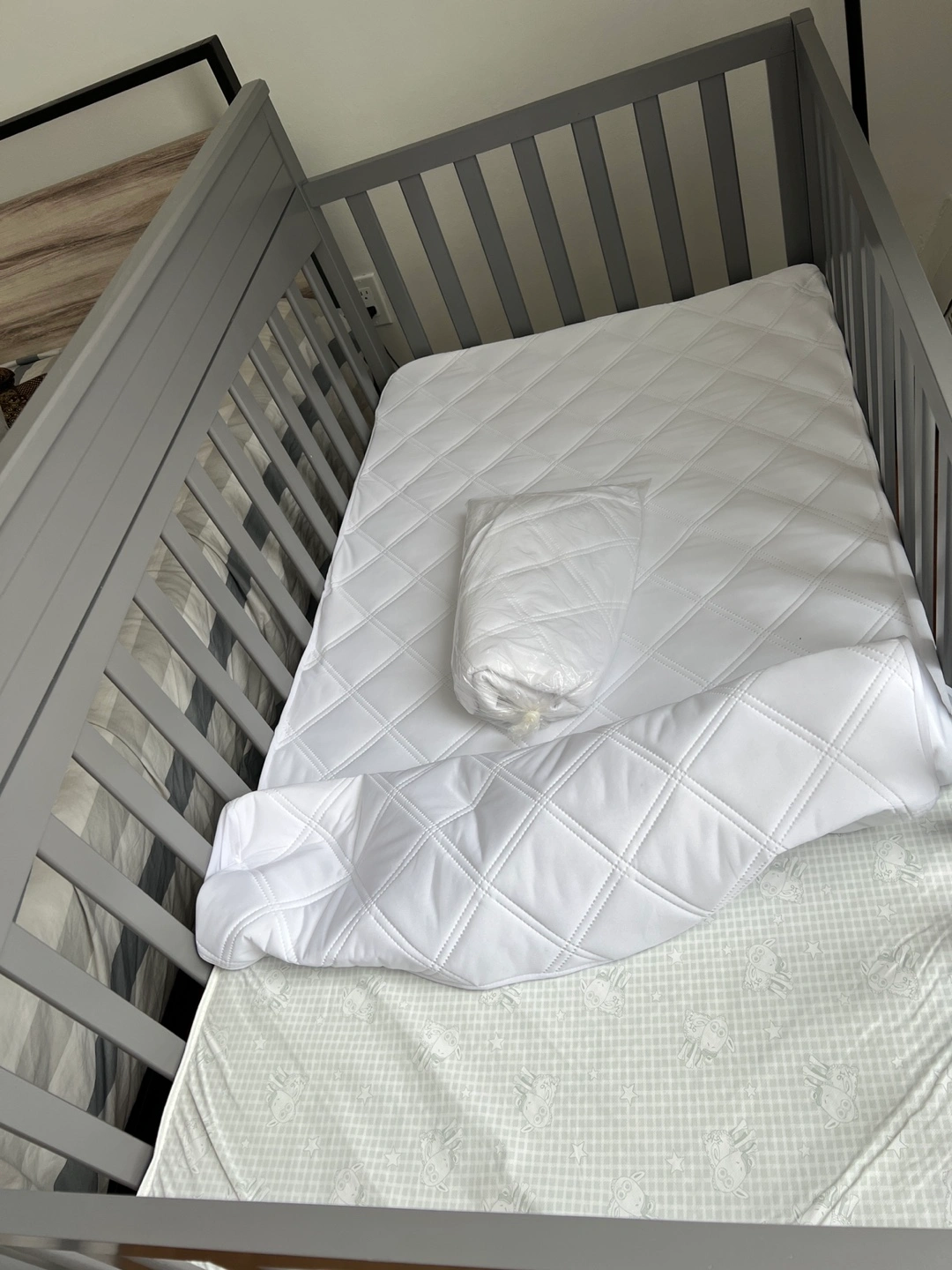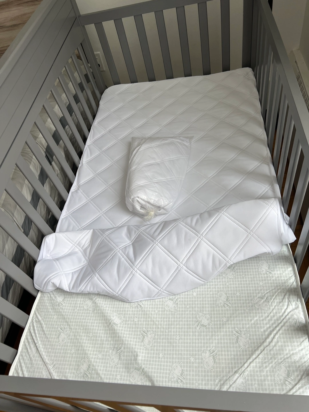 Includes waterproof mattress with a waterproof liner/pad and a new waterproof crib pad/liner.
