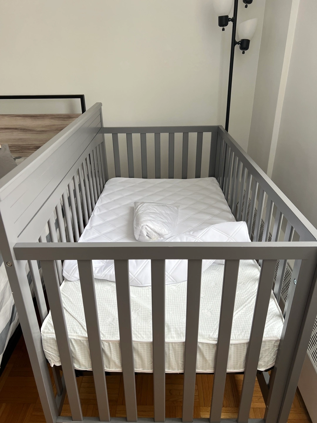 Grey UNUSED Baby Crib convertible with Mattress and Pad