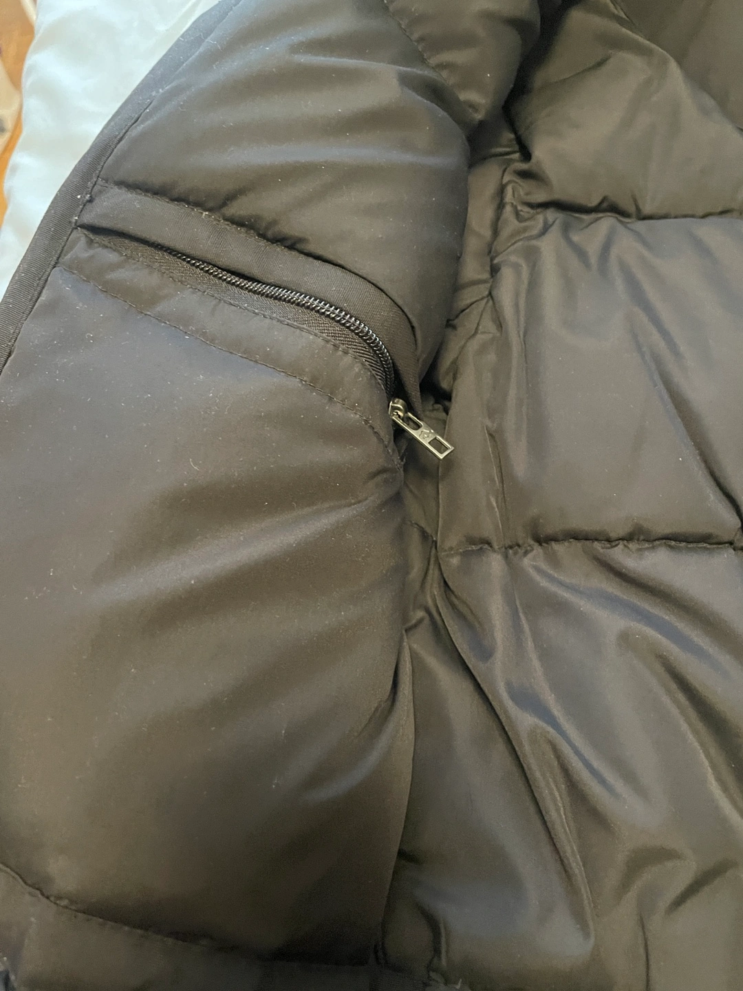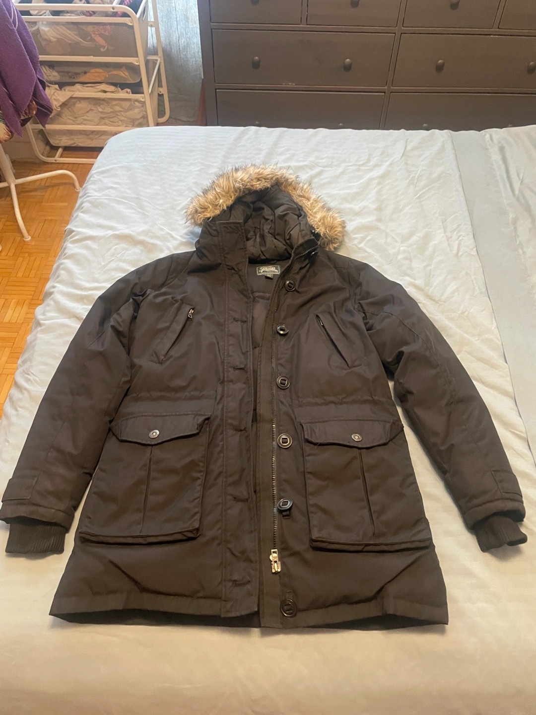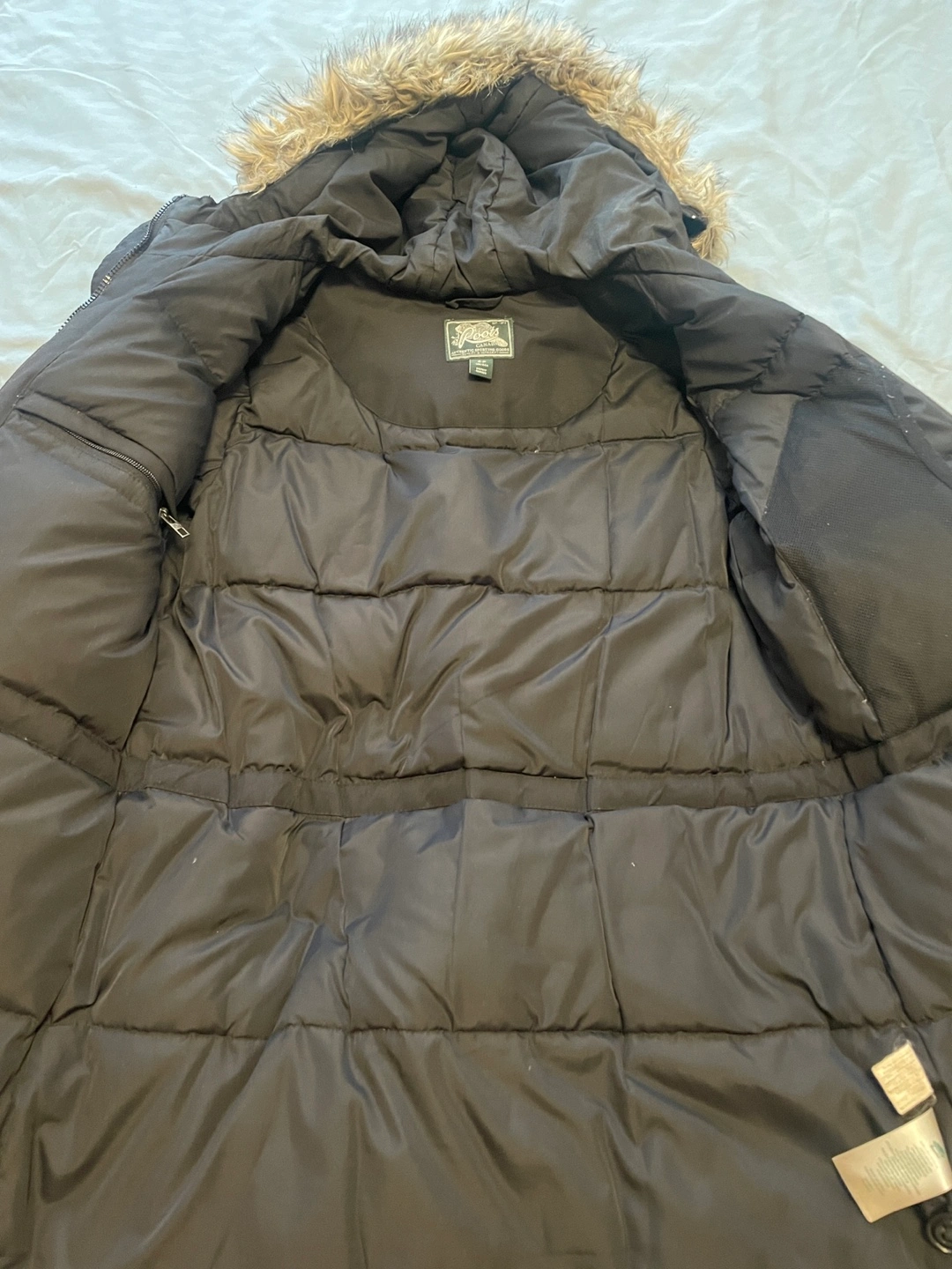 Front zipper needs to be fixed! Other than that, it’s in really good condition. There’s 6 outer pockets and two inner pockets. The fur can be removed from the hood.