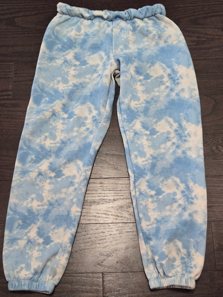677Cute joggers. Light blue and white tie-dye pattern. Elastic waistband. Soft cotton feel. Great for lounging