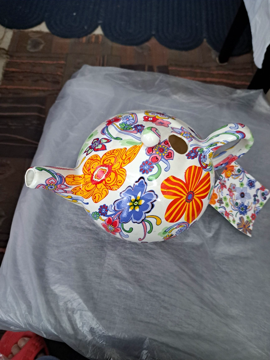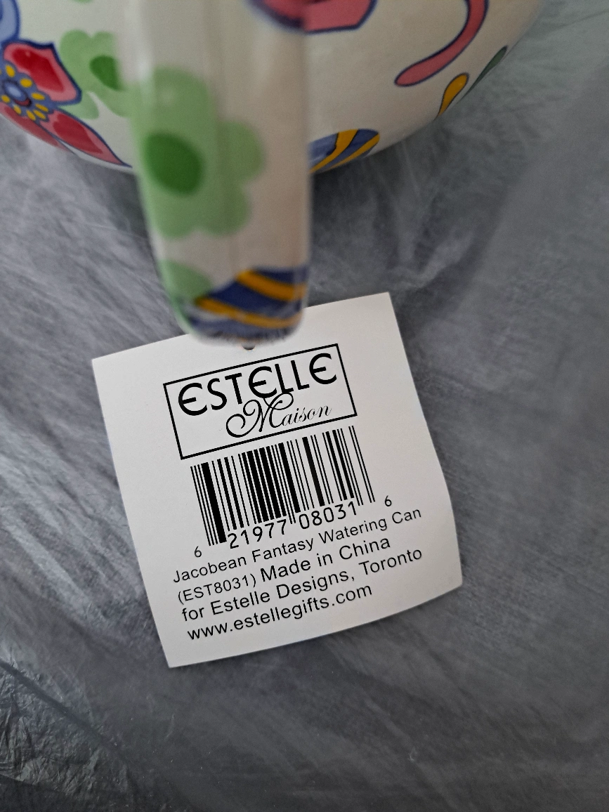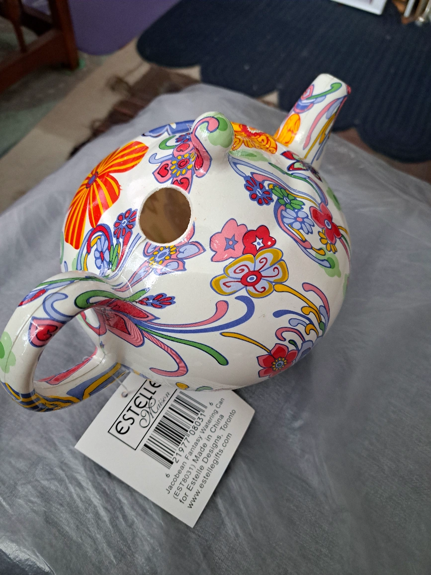 Brand New Hand-painted ceramic watering can. Features a floral design. Made in China for Estelle Designs, Toronto.