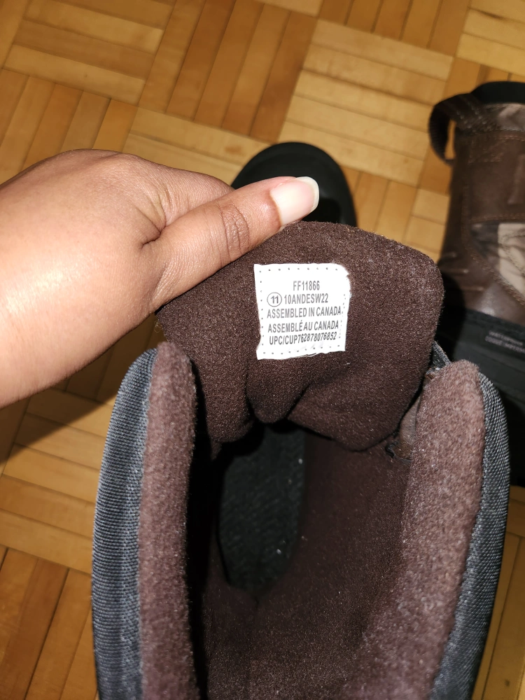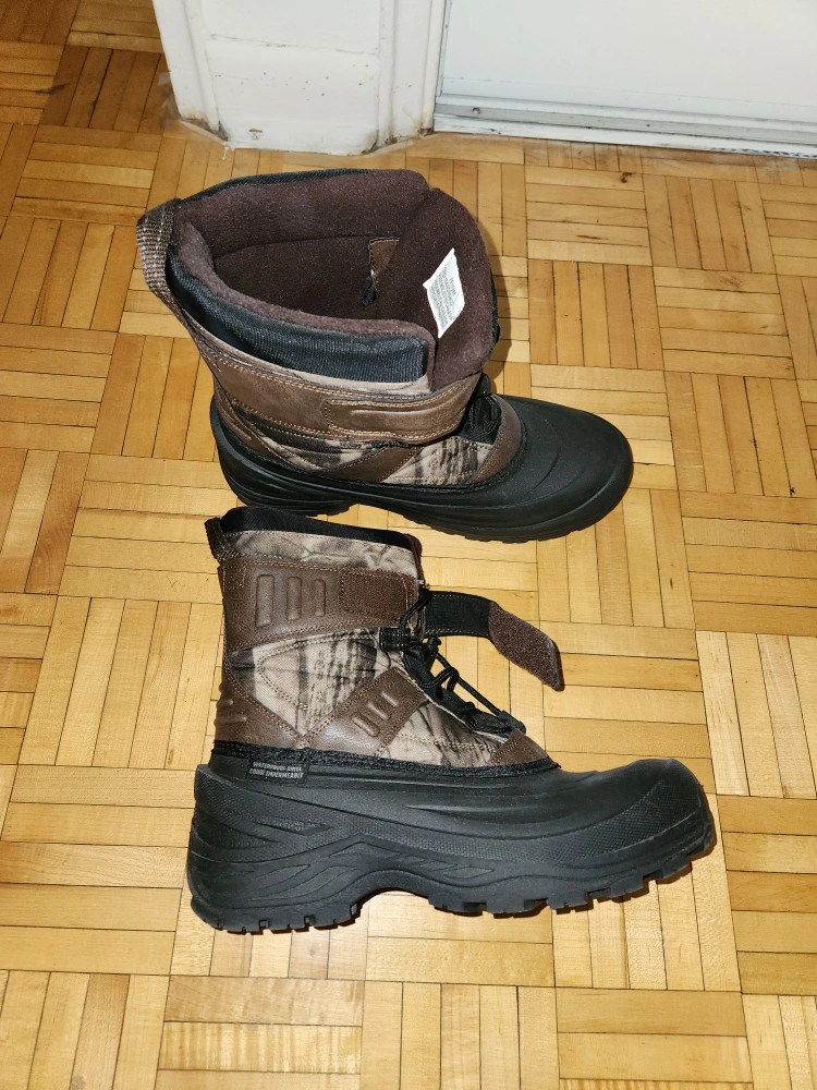 12Warm, waterproof winter boots. Brown and camouflage pattern. Good condition. Velcro straps and laces. Assembled in Canada.