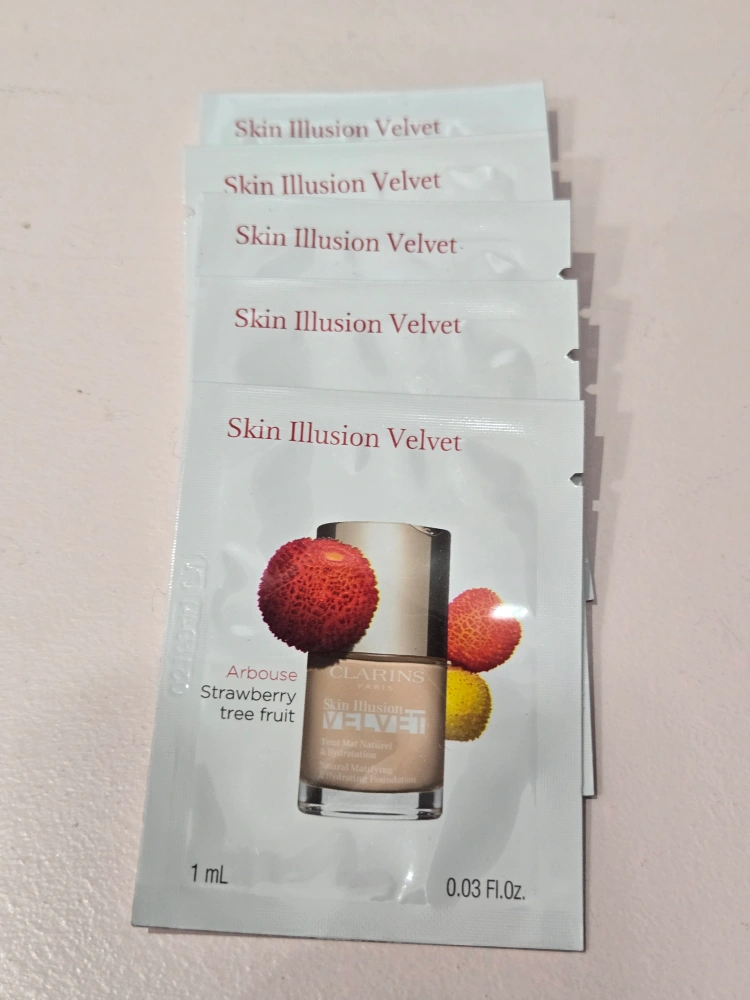 677Six 1ml samples of Clarins Skin Illusion Velvet foundation. Mattifying, natural-looking finish. Strawberry tree fruit extract.