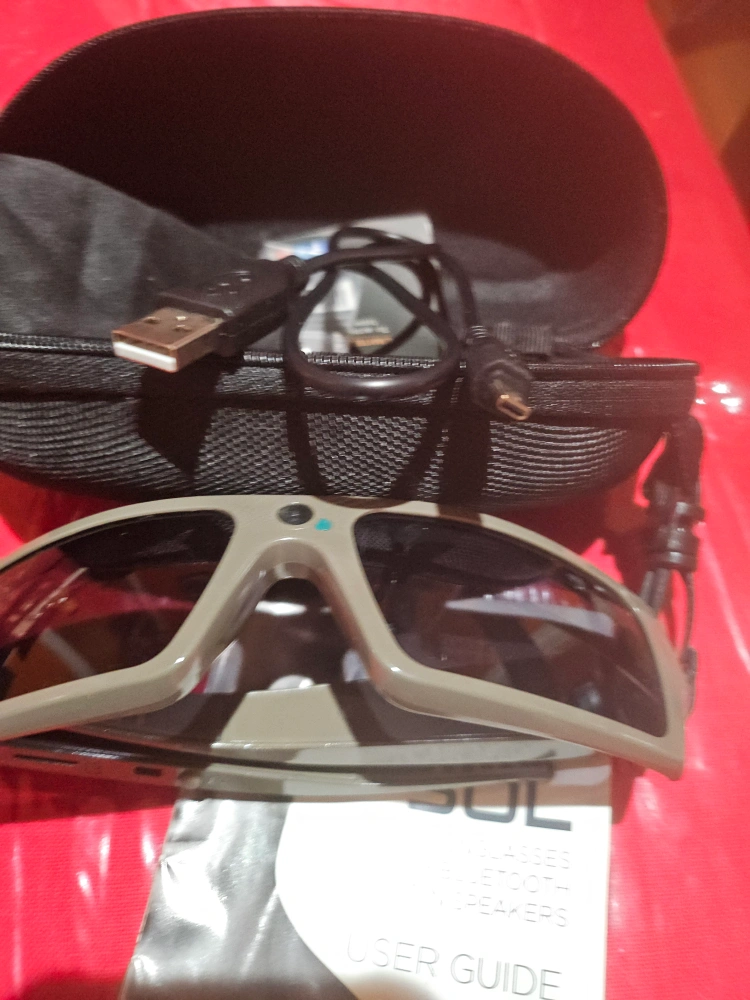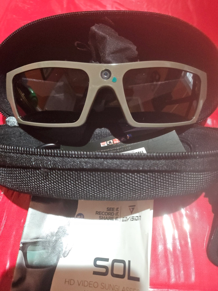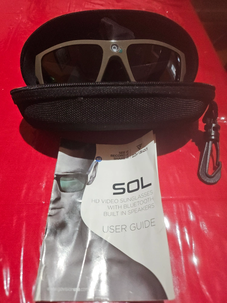 Video sunglasses, Bluetooth enabled, built-in speakers. Includes case and user guide. Great for recording and sharing.