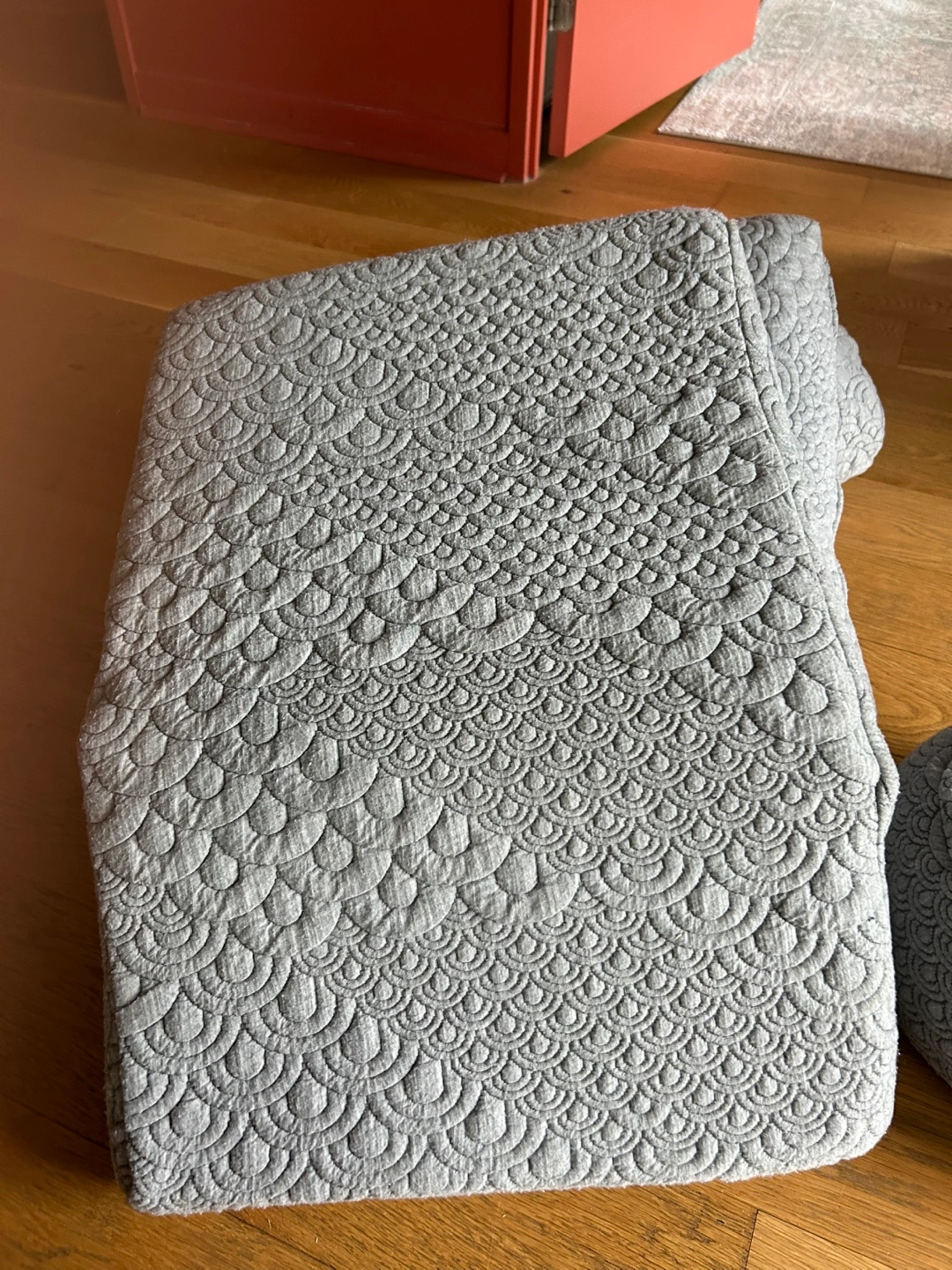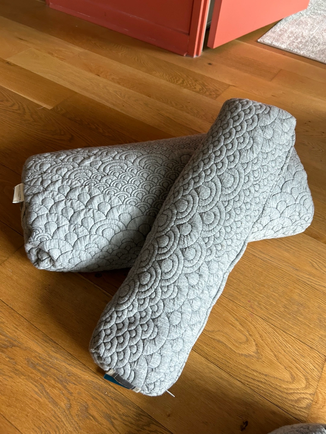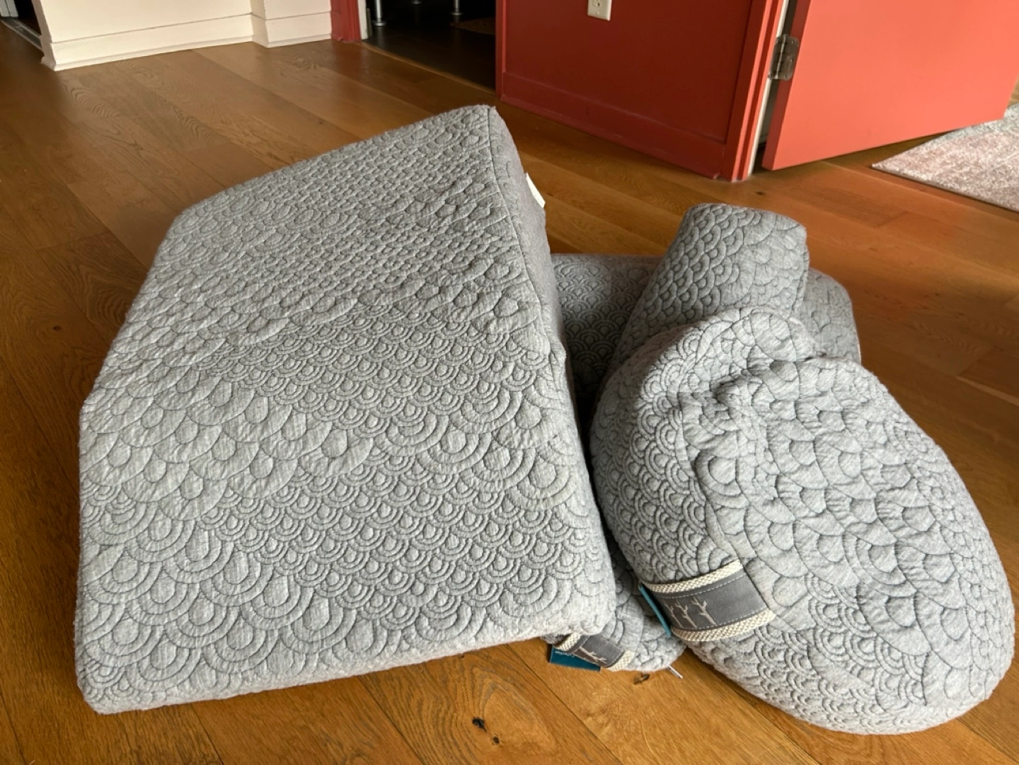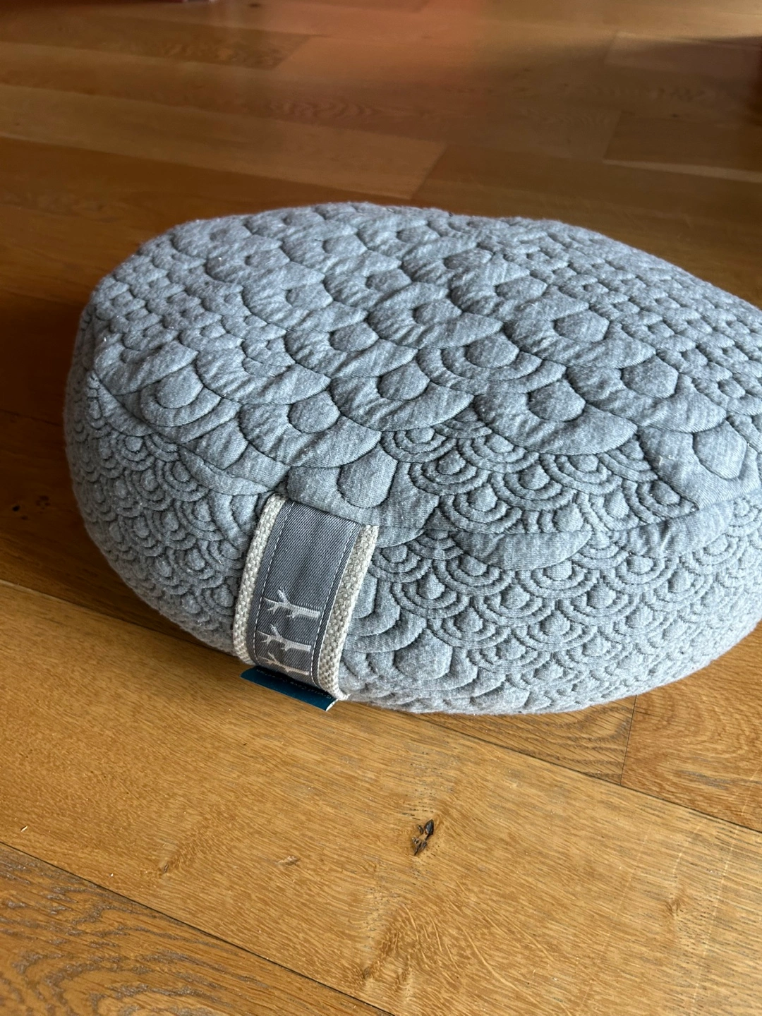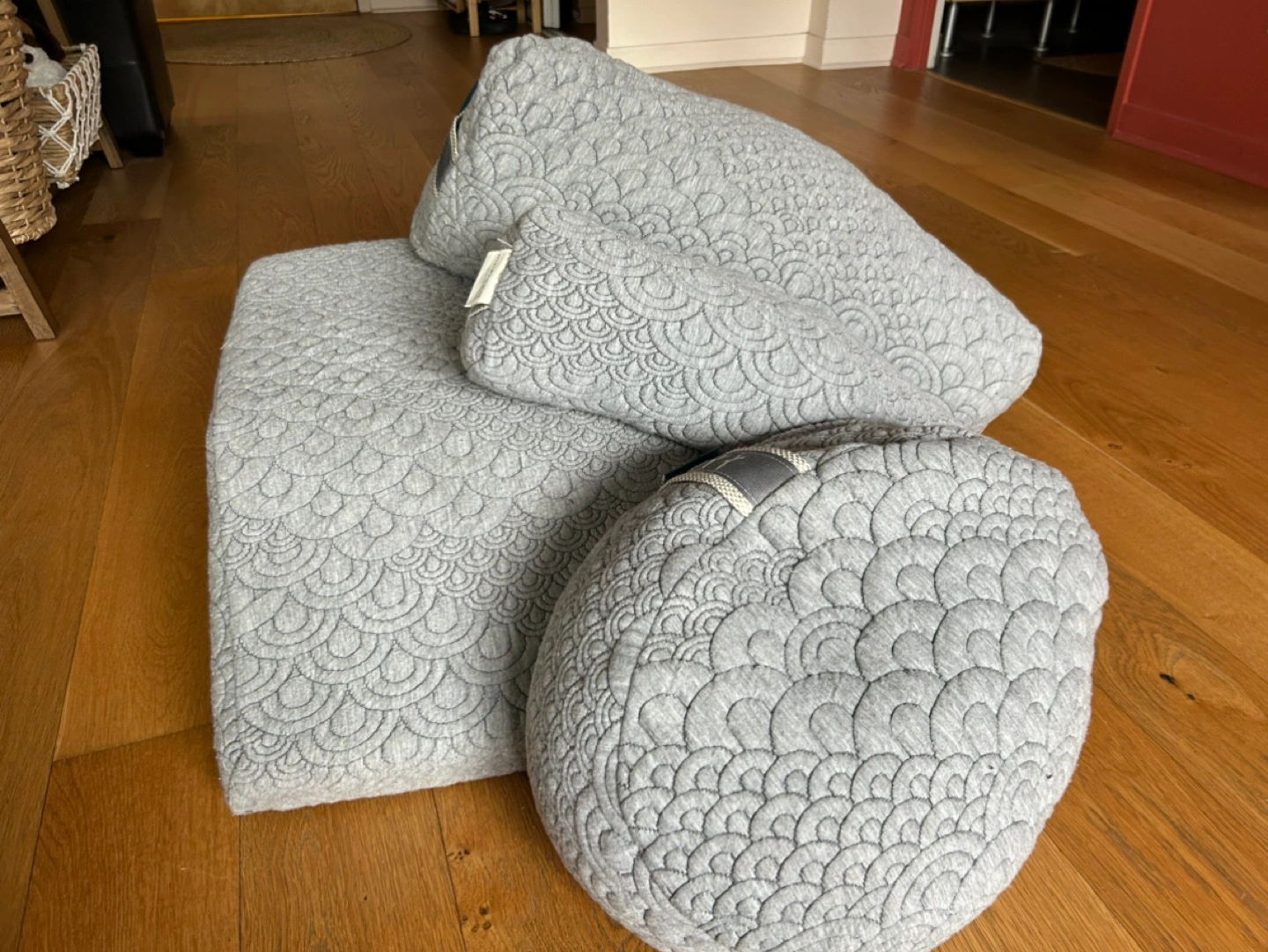 Cozy grey quilted meditation set. Includes a bolster, cushion and a blanket. Soft fabric, unique design. Perfect for yoga or relaxation.