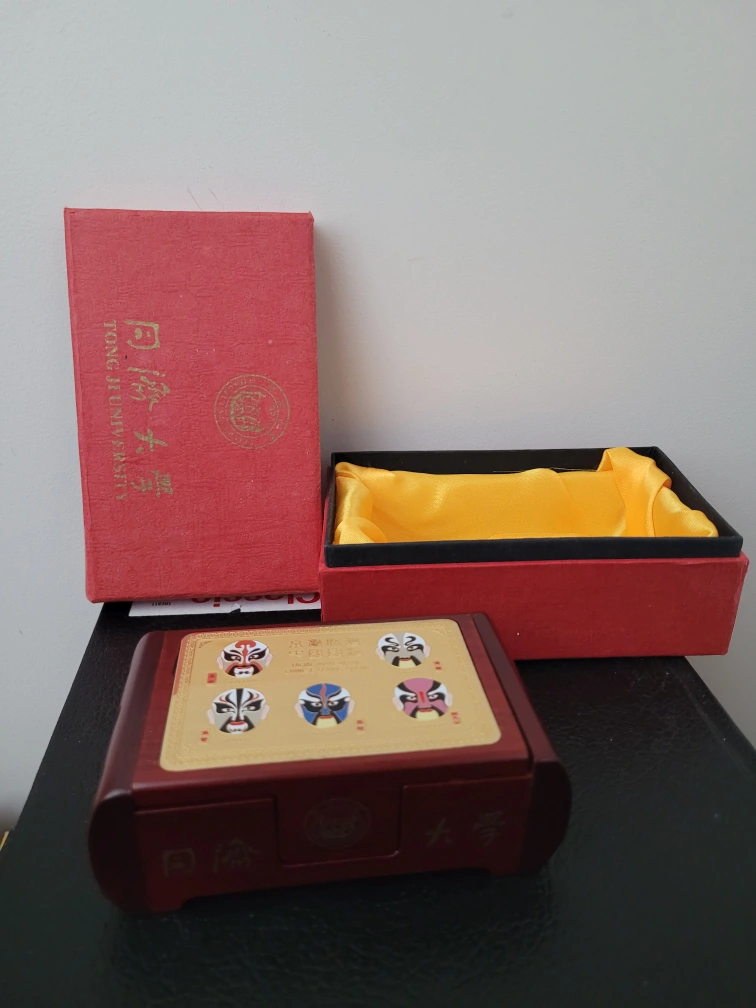 879Small collectible box. Features 5 different Peking Opera face masks. Red and gold design. Comes with outer and inner boxes. From Tongji University.