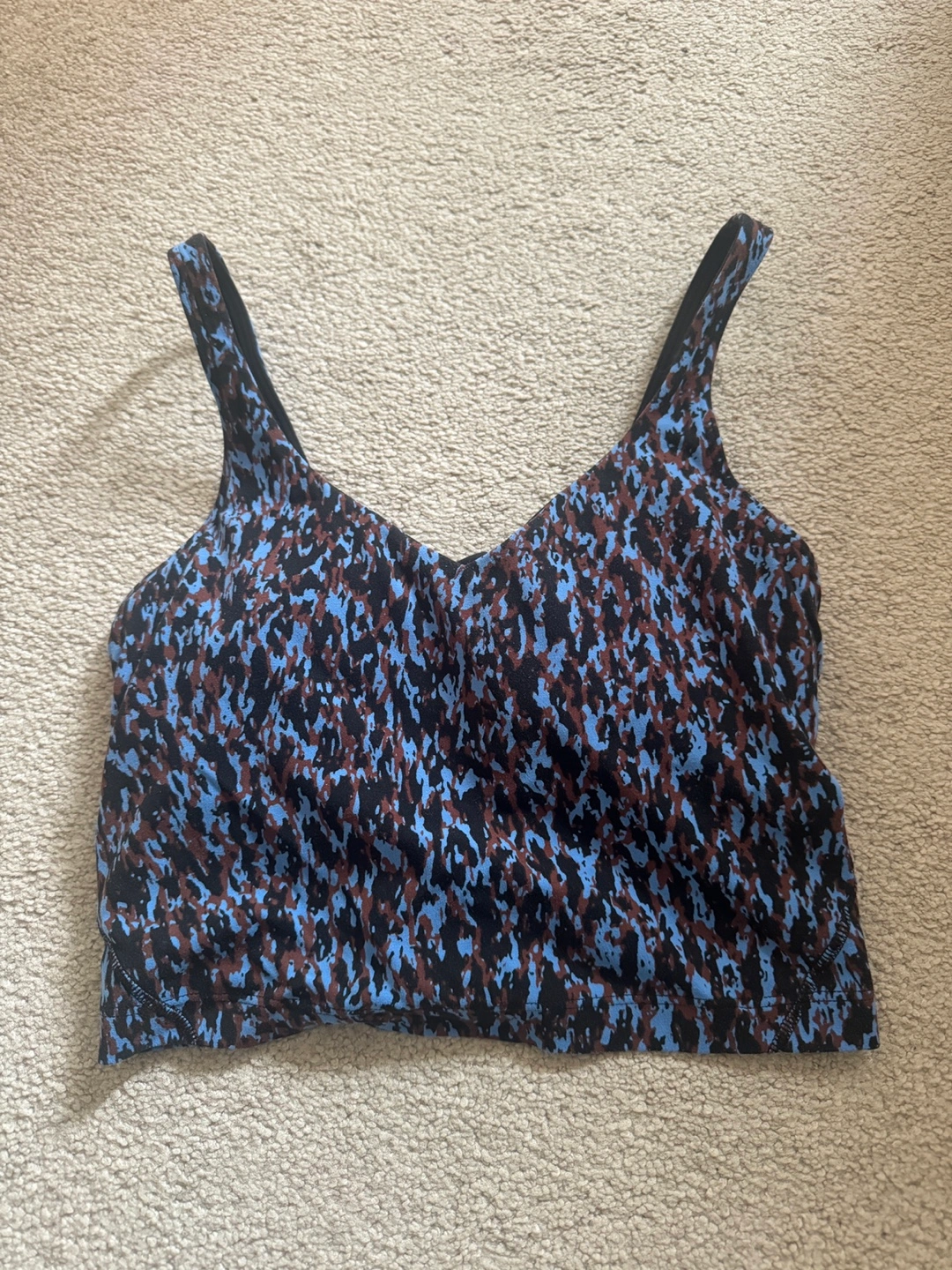 Lululemon athletic crop top. Blue and brown camo print. Scoop neck. Great for yoga or working out.