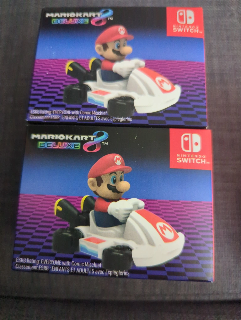one Mario Kart 8 Deluxe McDonald's toy, feature Mario in a go-kart. Boxes are in excellent condition, $6 each or trade for bowser?
