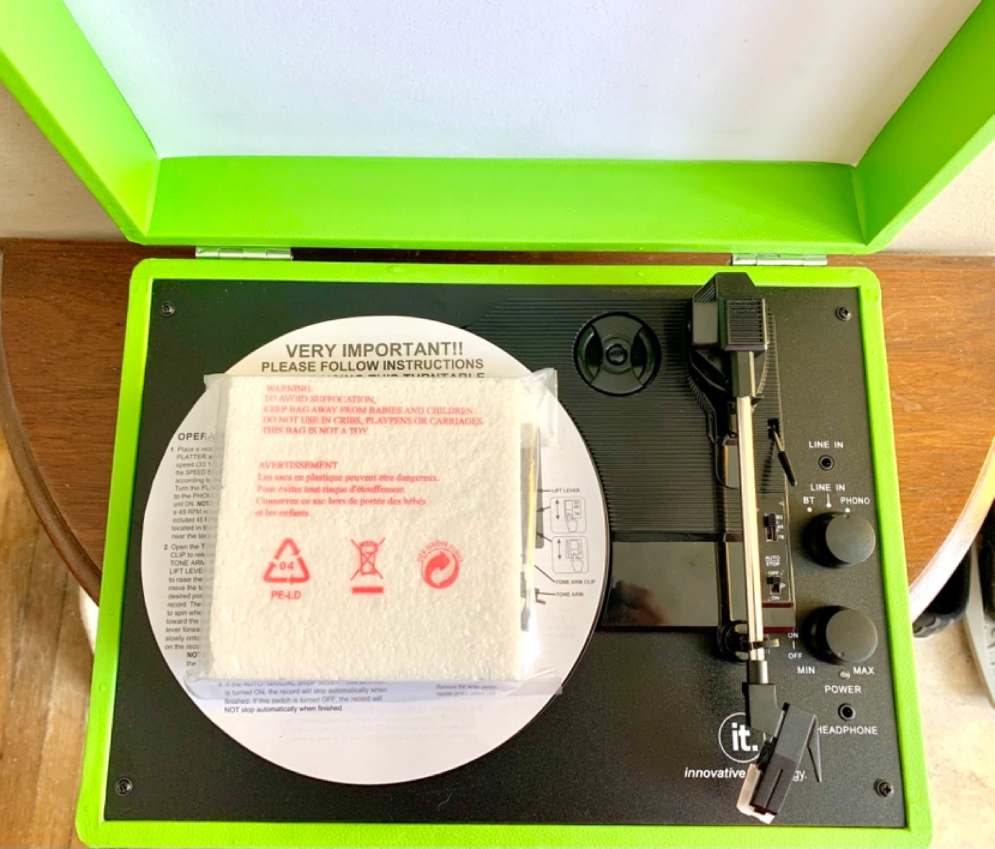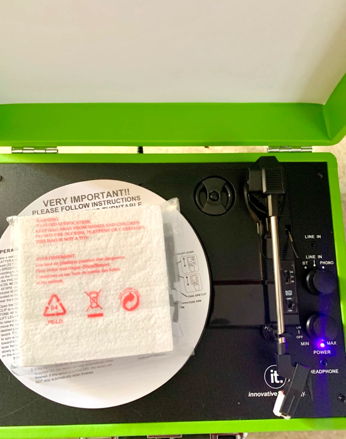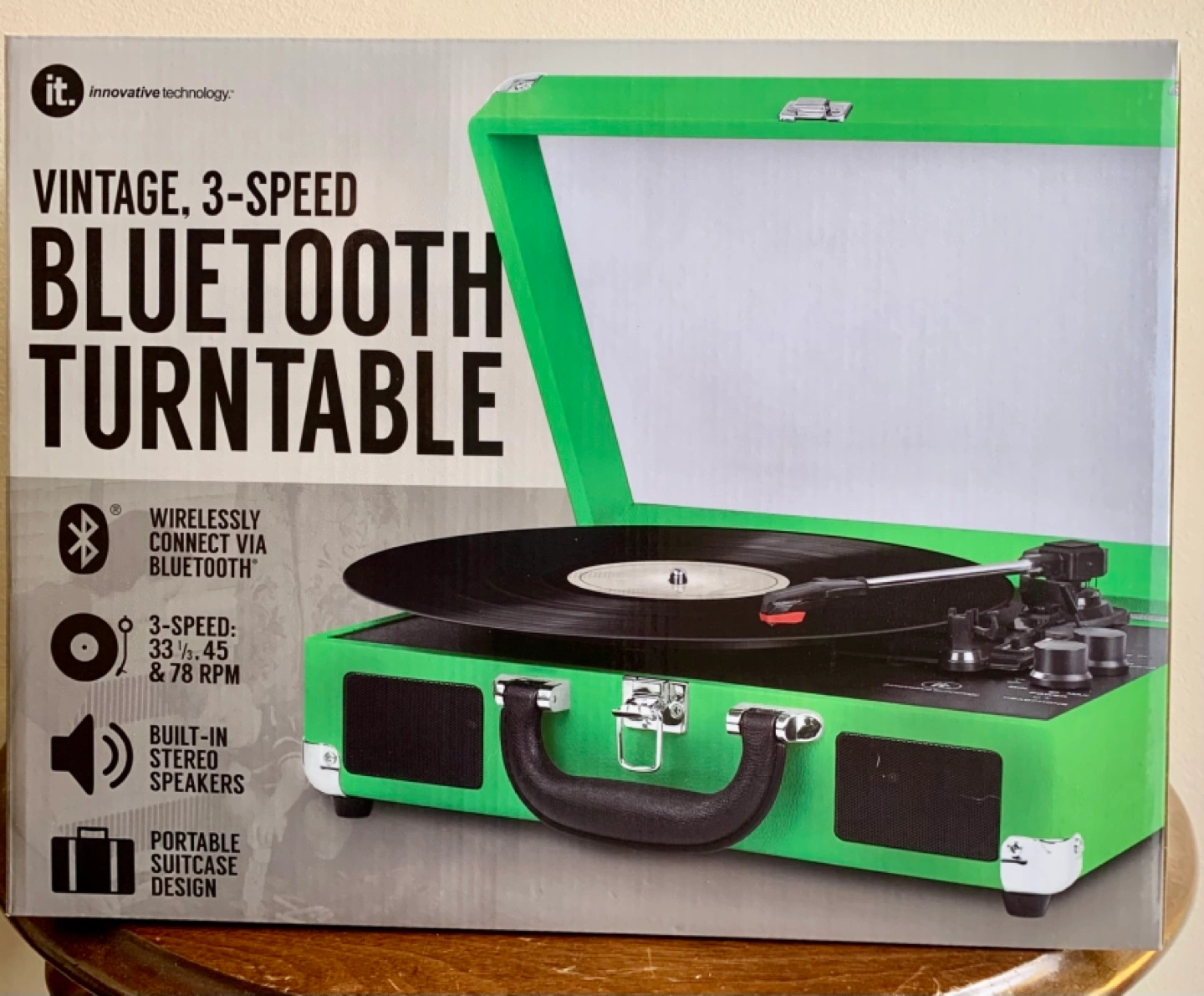 BNIB! Only plugged in to show it’s working. Portable suitcase design. Built-in stereo speakers. Plays 33 1/3, 45, & 78 RPM records. Connects wirelessly via Bluetooth. Includes extra needle, booklet, cord. Fun lime green colour!