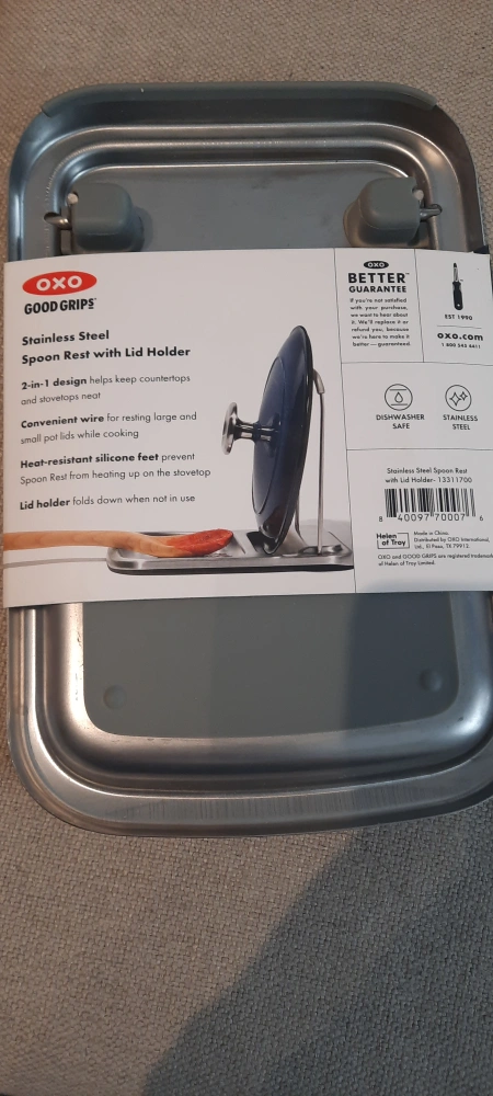 New OXO Good Grips spoon rest. Stainless steel. Includes lid holder. Folds flat for storage. Heat-resistant. Dishwasher safe.