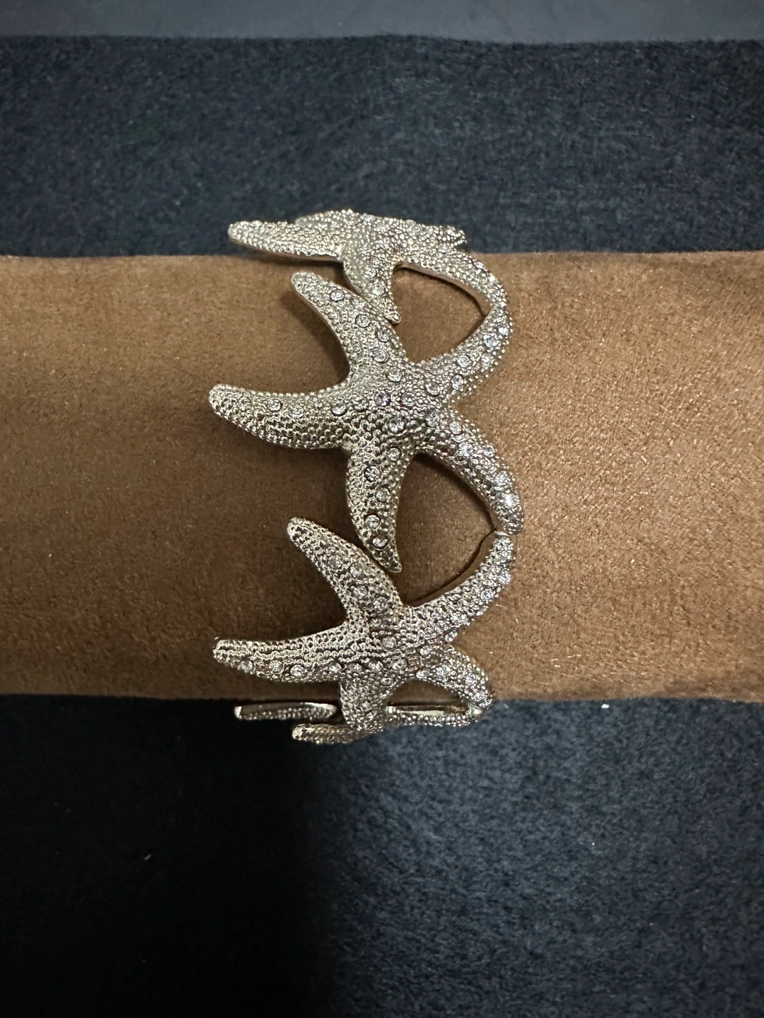 Stunning silver starfish bracelet. Rhinestone accents. Great summer accessory.
