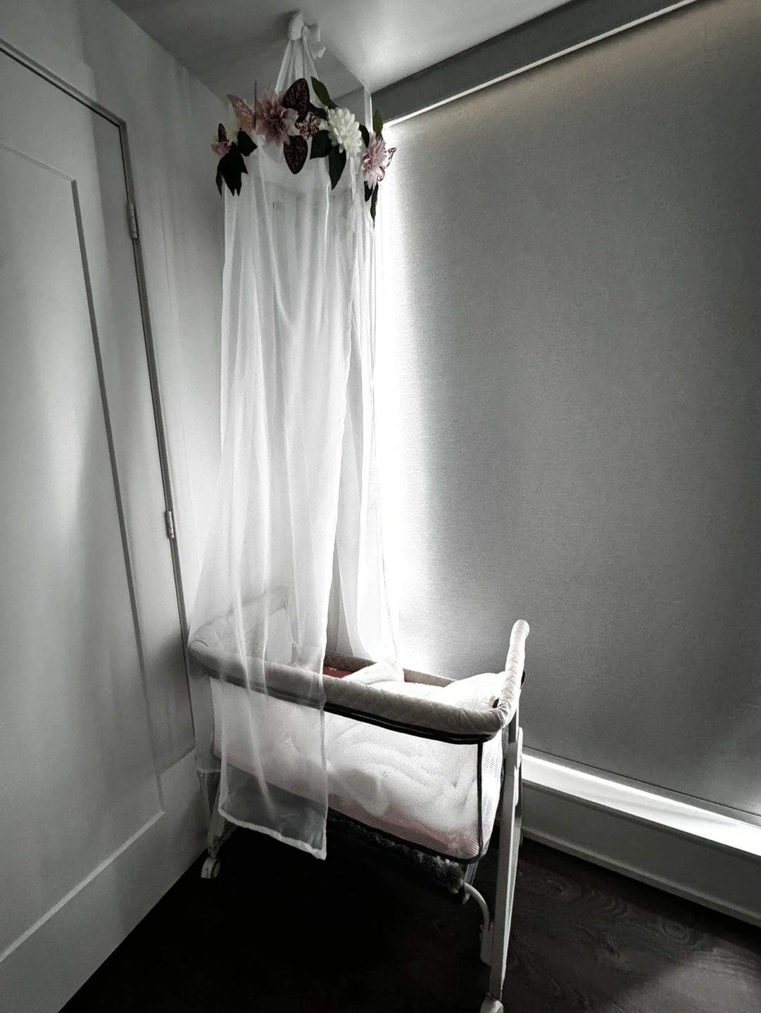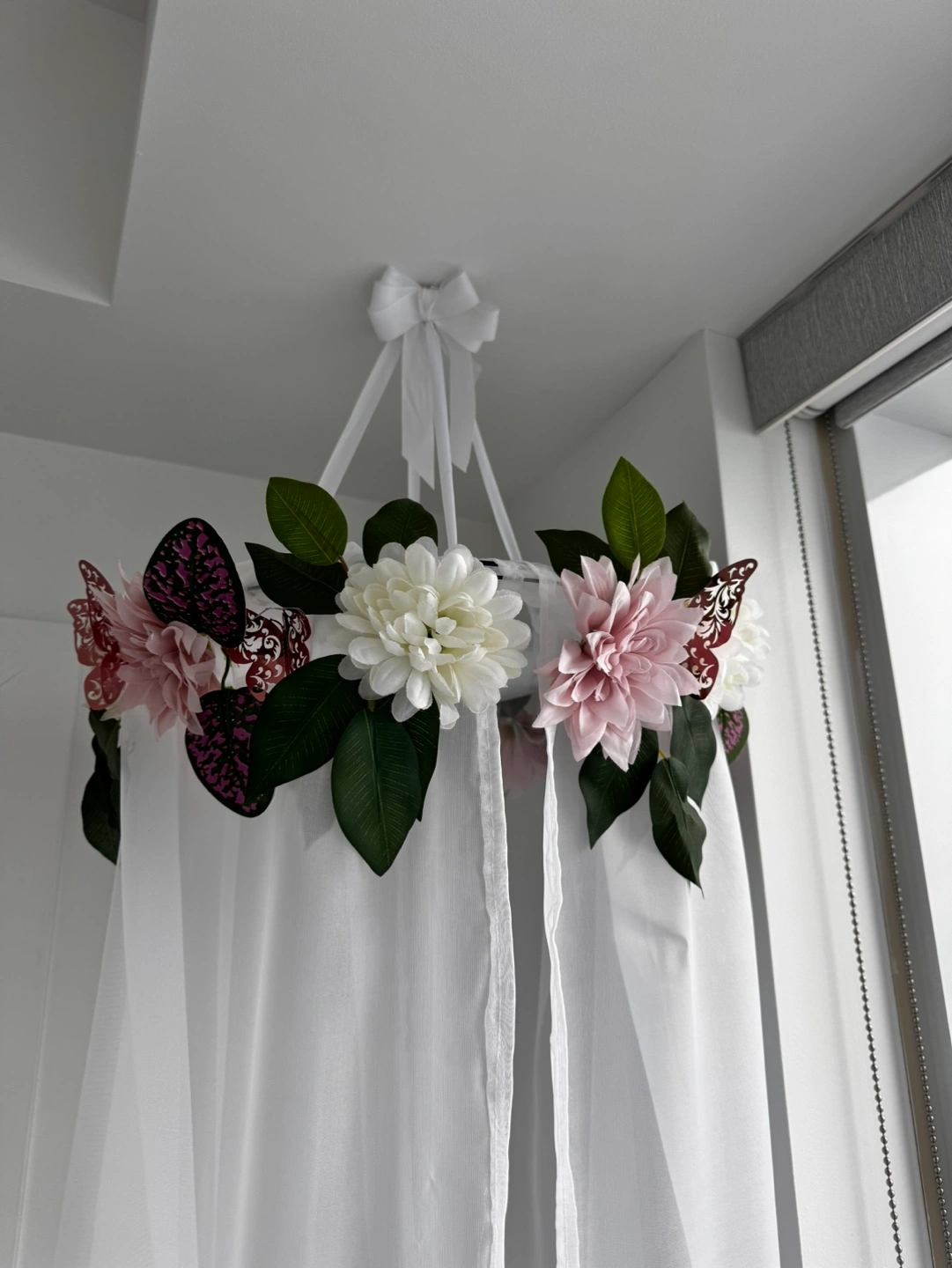 sheer white canopy with floral accents. Great for a nursery. I mounted without drilling