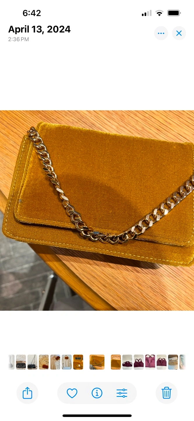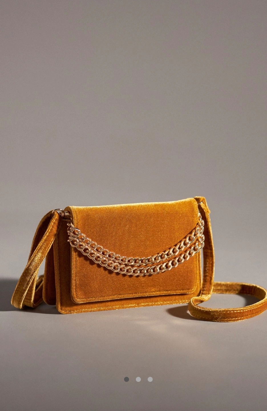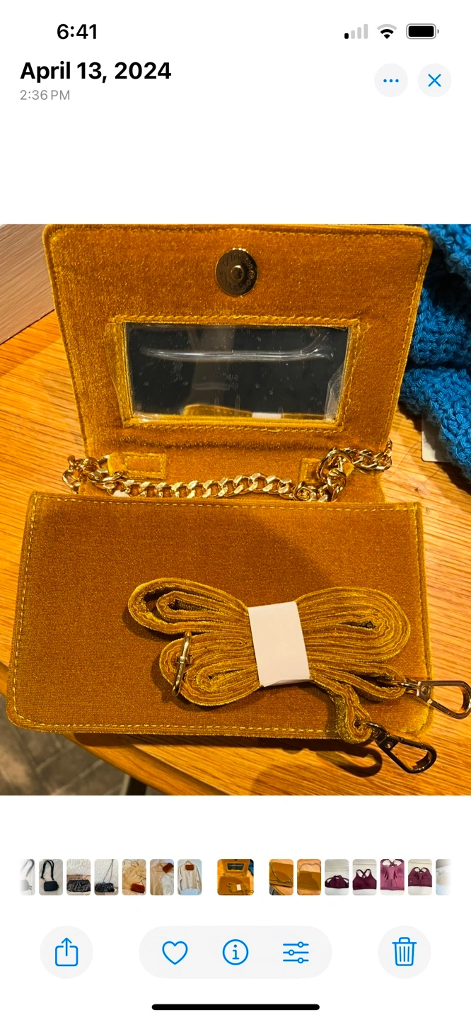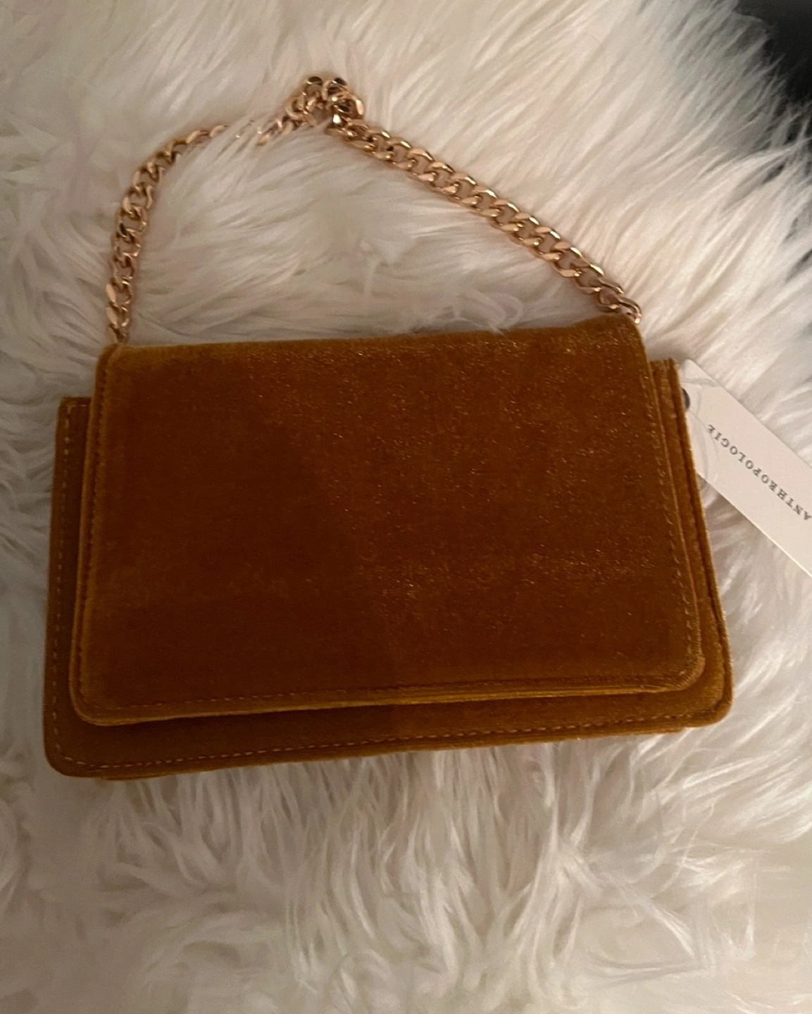 Anthropologie yellow velvet crossbody bag. Features a gold chain strap and adjustable shoulder strap. Interior mirror. Perfect for evenings out. New with tags.
