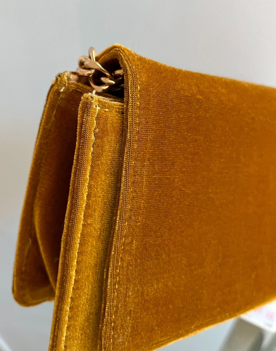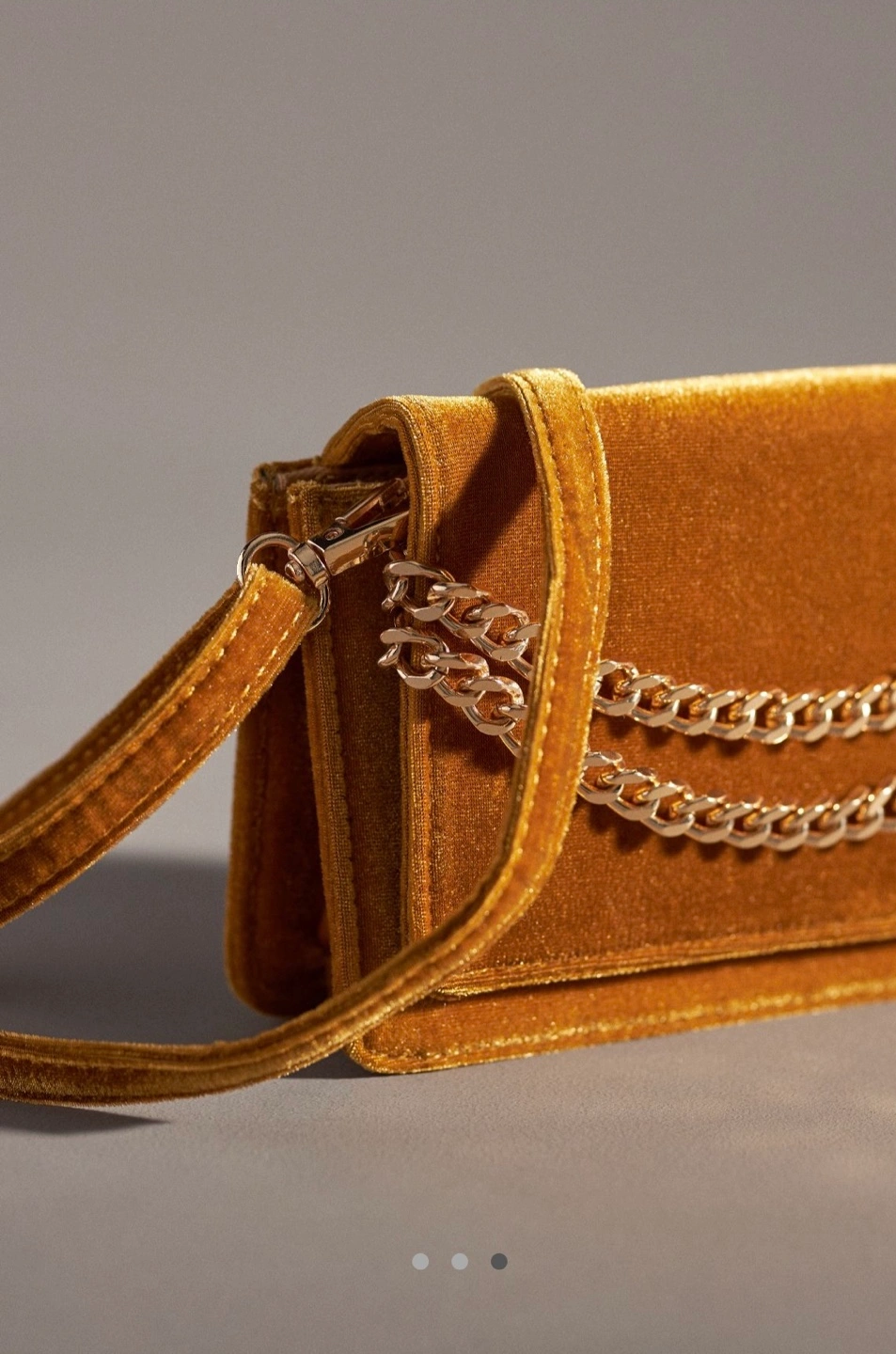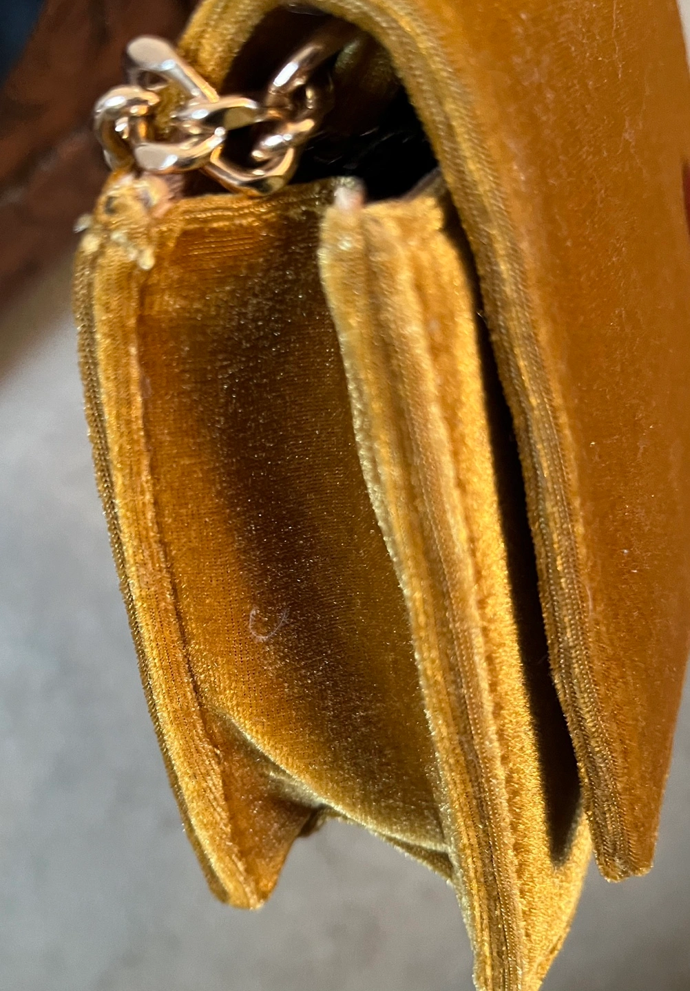 Anthropologie yellow velvet crossbody bag. Features a gold chain strap and adjustable shoulder strap. Interior mirror. Perfect for evenings out. New with tags.