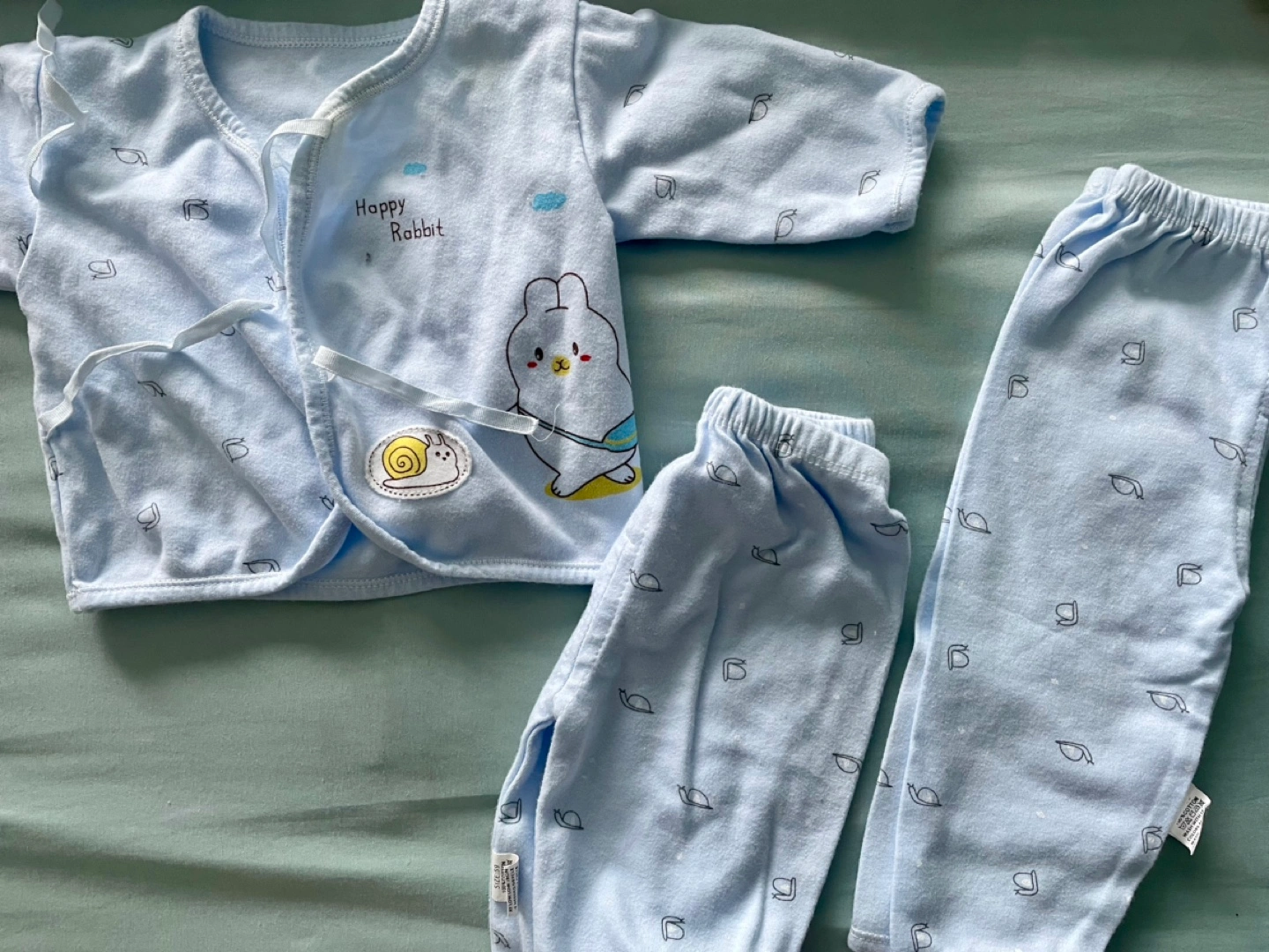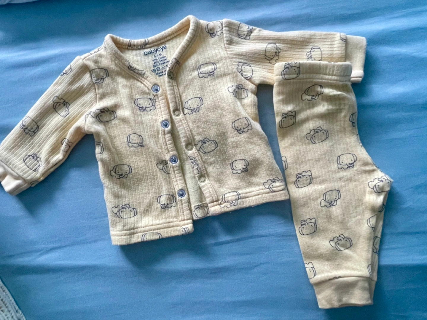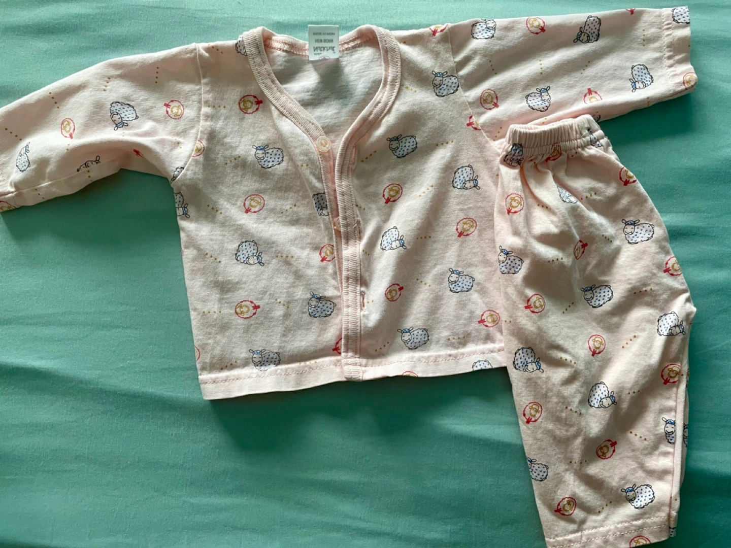 Six adorable newborn baby outfits. Various colours and patterns. Long-sleeved shirts and pants. Snap closures on shirts. Soft fabrics. Perfect for your little one.